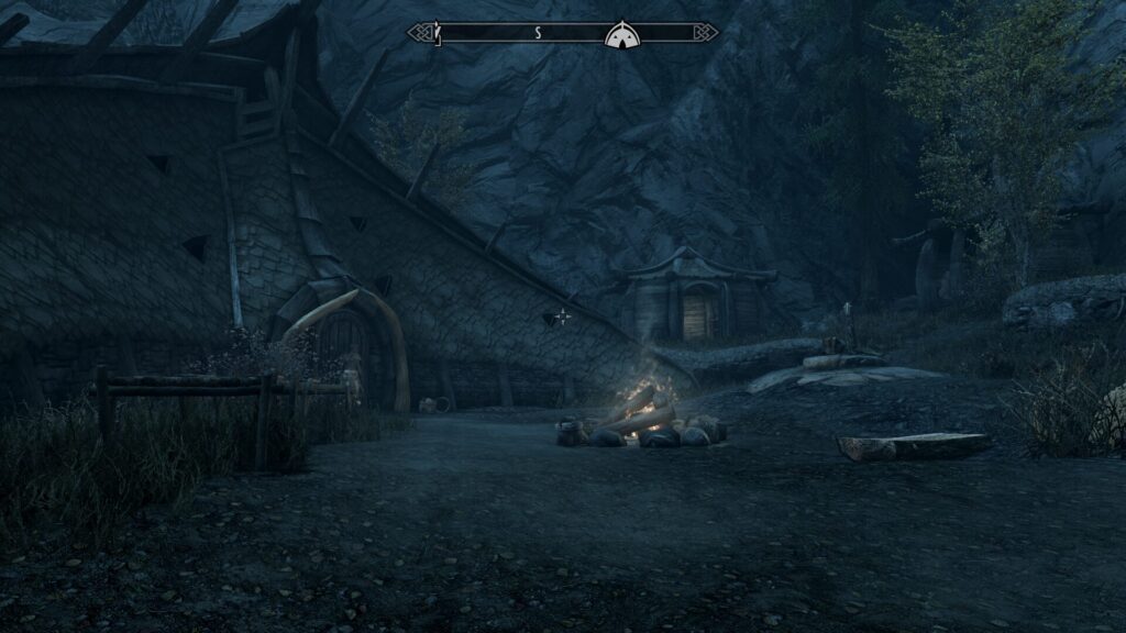 建築が人間のとだいぶ違いますね。ちょっと薄暗くて申し訳ないんですが、でっかい長屋が1つあって、周囲には倉庫とか鍛冶場のような施設がぽちぽち建っているといった感じです。ちょっとホビット村感あるもんな!