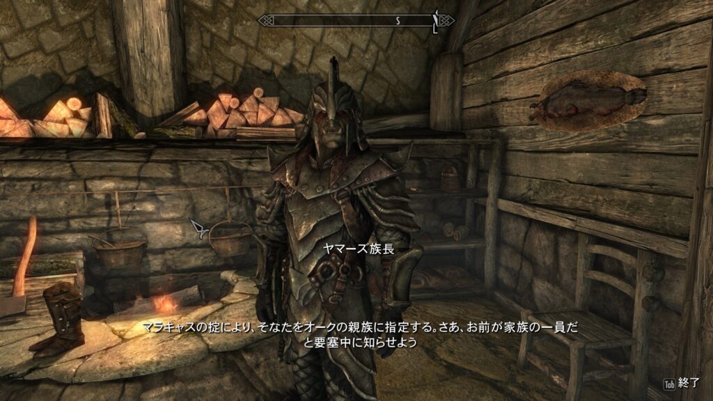 さてこんな夜遅くにも関わらず家凸するとかいう無礼ゴリラなんですけれど、オーク社会は夜間の家凸に寛大なのか何も言われませんでした。人間社会だったら夜8時以降の家凸は衛兵呼ばれたりするっていうのにな…!早速、手土産の鍛冶の巨匠の指をお渡ししたところ族長は喜んでくれました!