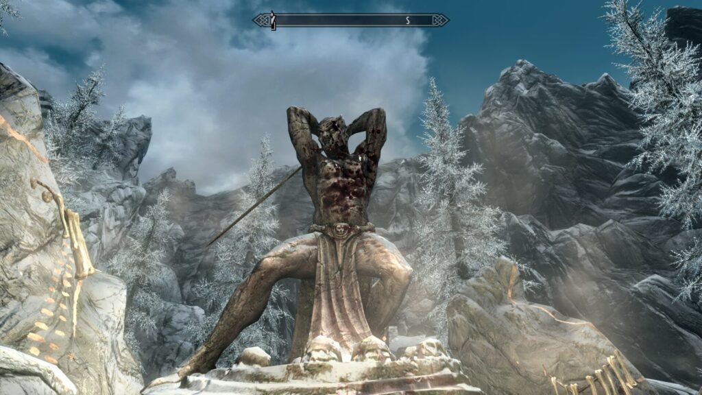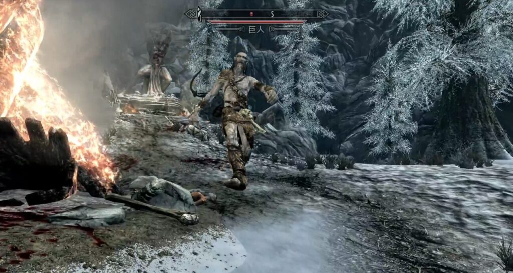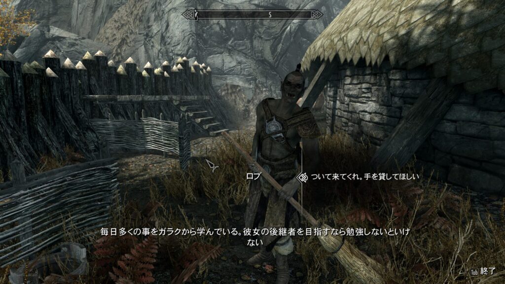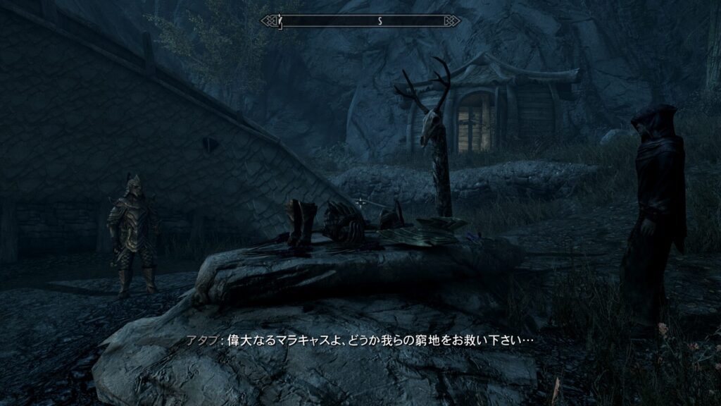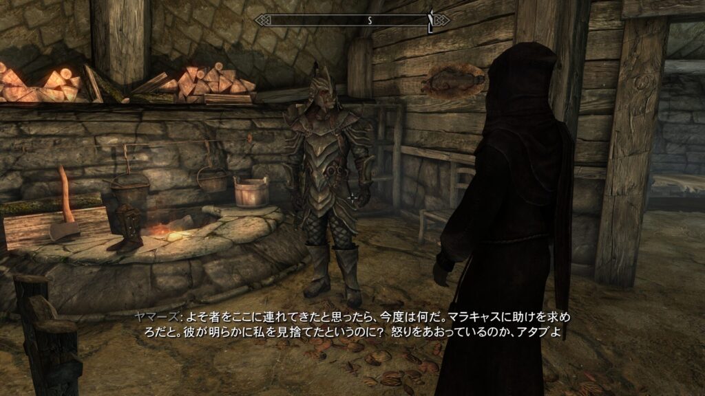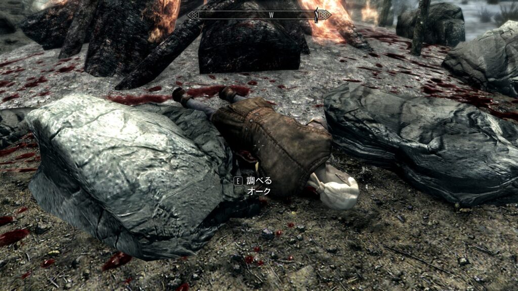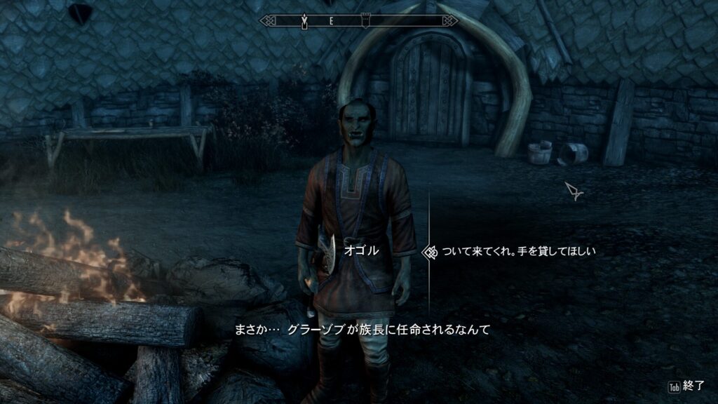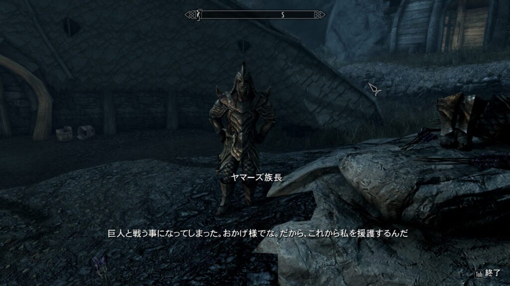 簡潔に言うと、ここのオーク要塞の族長であるヤマーズさんが弱ったことをきっかけに、近隣の巨人が要塞を襲うようになってしまったんだそうです。本来オーク要塞はドラゴンボーンが近づくと追い払ってくるのが常なので、助けを求めてきたということはよっぽどの危機なのでしょう。で、この時に巨人についてちょっとした仮説が立ちました。
