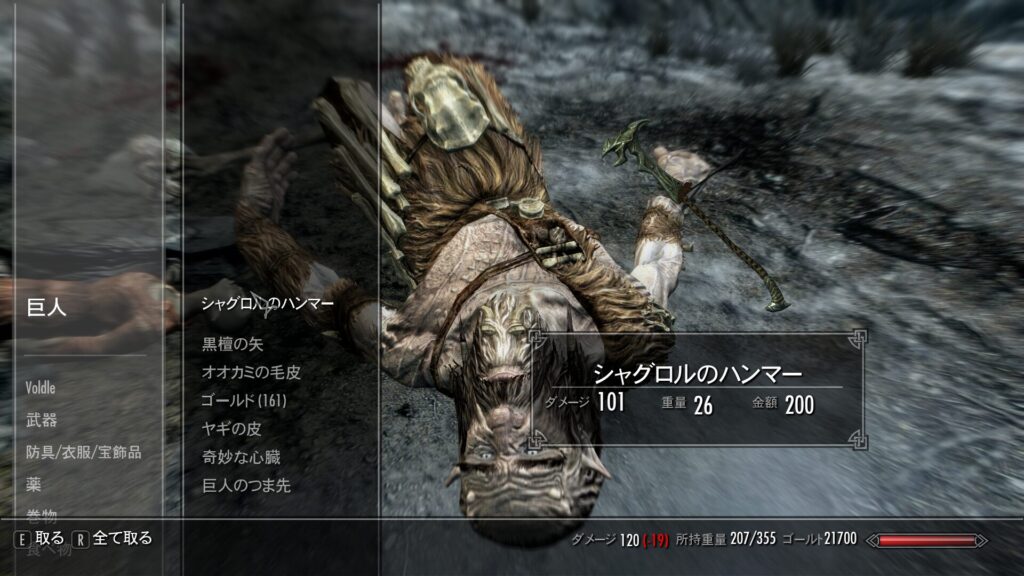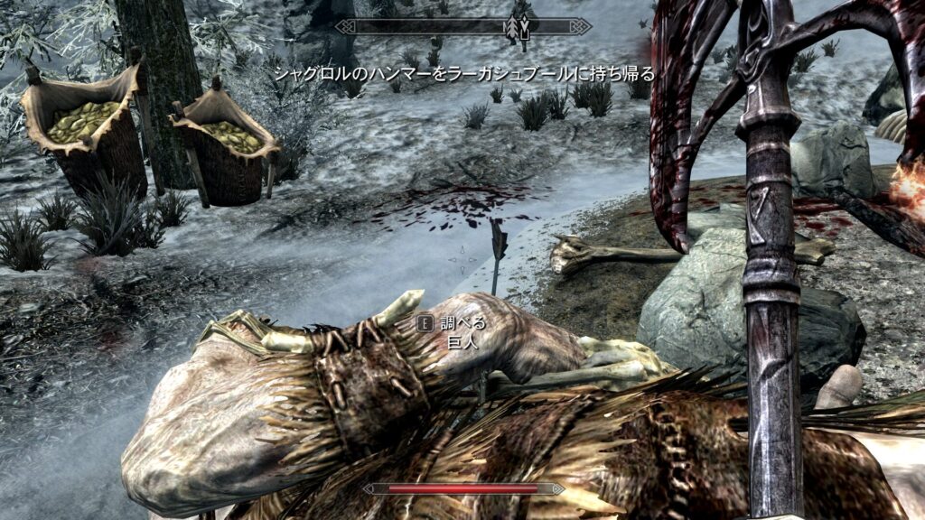 ちなみにそんな強くなかったです。膝の皿を叩き割ったらそのまま死にました。で、この巨人はシャグロルっていう名前らしいんですけれど、コイツのハンマーをラーガシュブールに持って帰ったらOK☆みたいな話だったはずです。