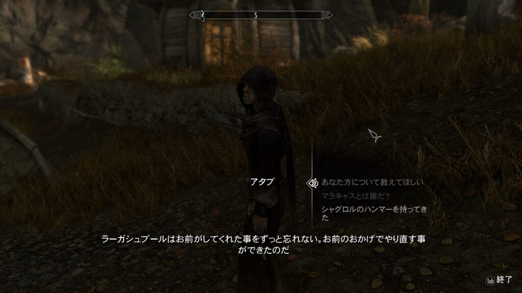 どうやら、ヤマーズ族長が何かしらやましいことをしていたのは今回が初めてではなかったようです。マラキャスもついに堪忍袋の緒が切れた的な話なんでしょう。なるほどな…!で、心配していた集落への影響なんですけれど、「鍛えてやらんとなあ」と言ってるってことは、マラキャスはラーガシュブールの皆の面倒はまだみてくれるっぽいなこれ…それは良かった!