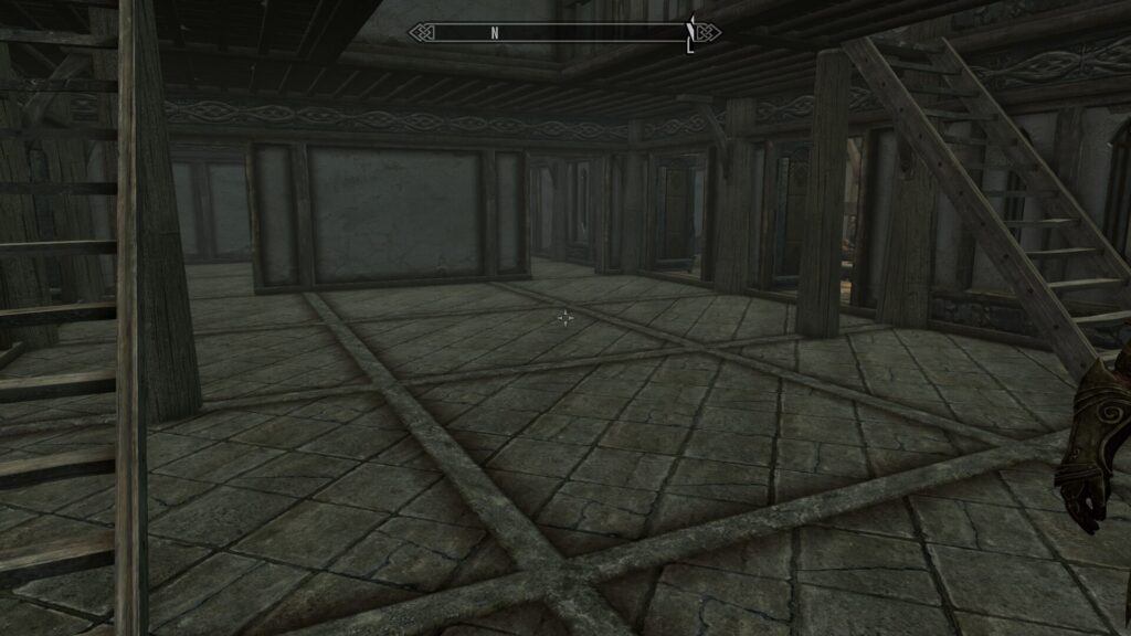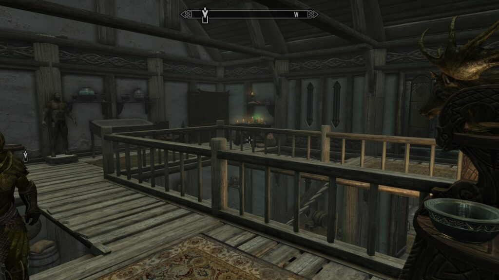 ここはちょっとしたポーチとか花瓶とか置いてあるのかな?スカイリム、摘んできた花を花瓶に生けるとかできたらいいのにな!一応頑張ったらいけるかもですが、多分読み込みの都合とかで花消し飛ぶんですよね。