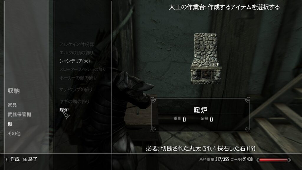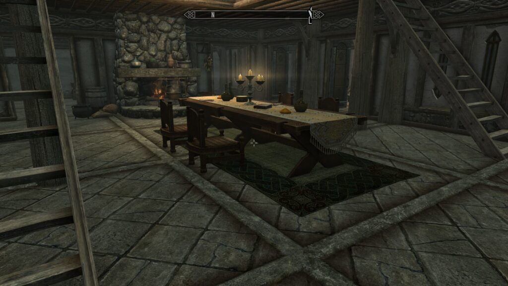 とりあえずリビングに置く大きいものはこんなところですかね。あとは収納なんかをちまちま置いていきましょう!スカイリムのマイホームは収納が無駄におしゃれだからな…!楽しみです。