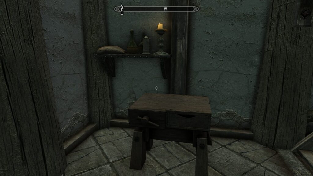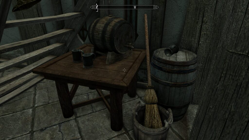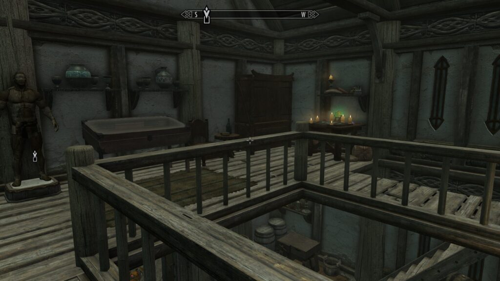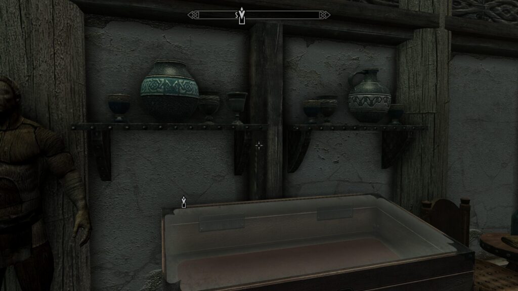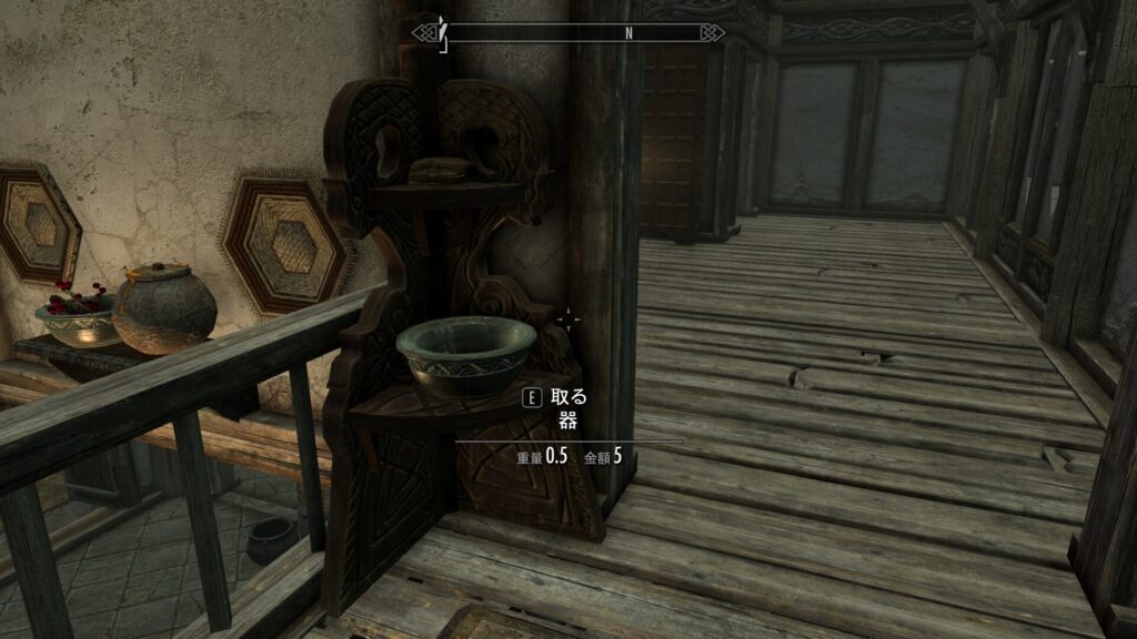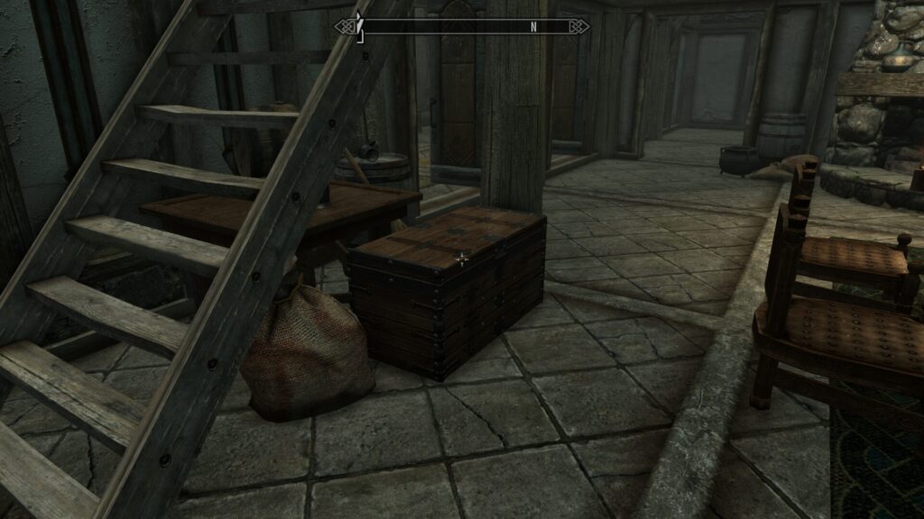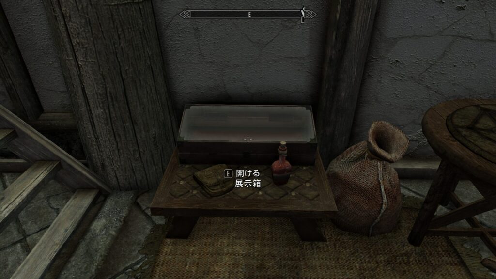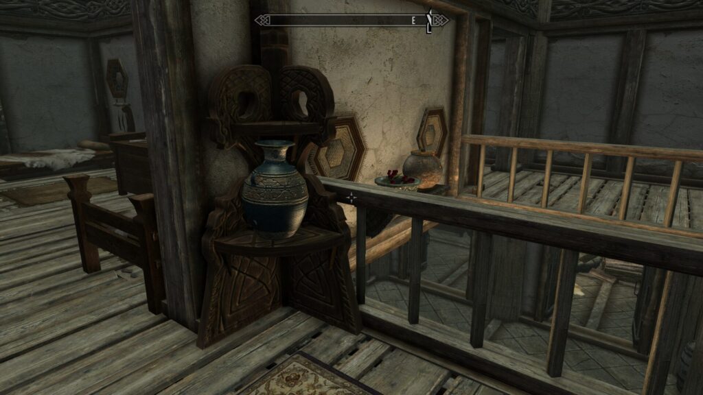 おばあちゃん家だったら間違いなく着物とか入ってそうな外見のタンスですが、廊下に出してるタンスっていうのは一体何を入れるものなんだ…?!現代人が見ても分からないということは、スカイリムの独特の文化の可能性がある…