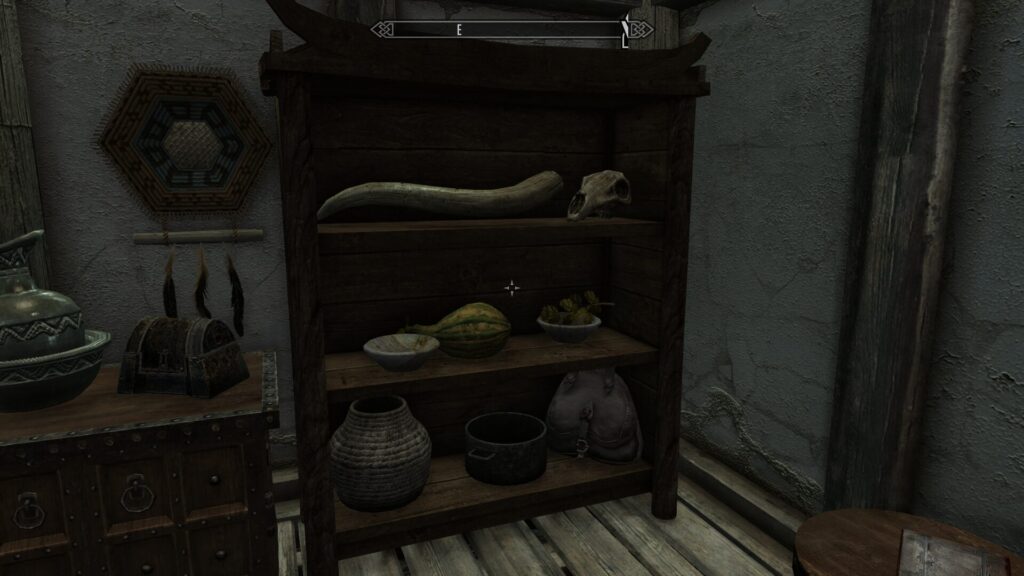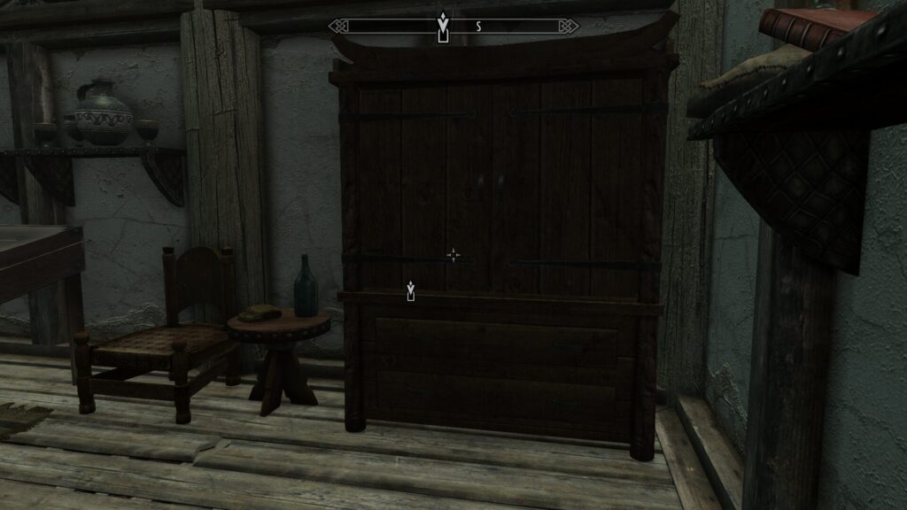 そうか!これ武具とか入れとくんじゃないか?!寝室のタンスに武具を入れるとおしゃれ着が傷ついちゃうし、風通りが悪くてお気にのアーマーが錆びちゃうかも!みたいなスカイリムの主婦の悩みを解決するためのタンスなのかもしれん。あるいは、女性によってはバッグ専用のクローゼットとか持っていらっしゃる方いるじゃないですか。つまり、これは嫁とか娘のお気にの武具を入れておく場所なのかもしれんな…!