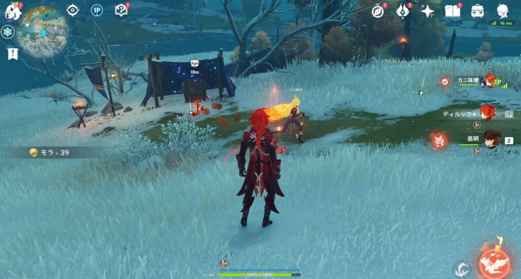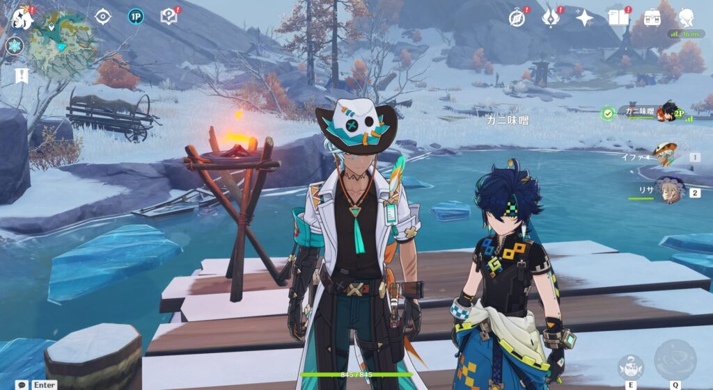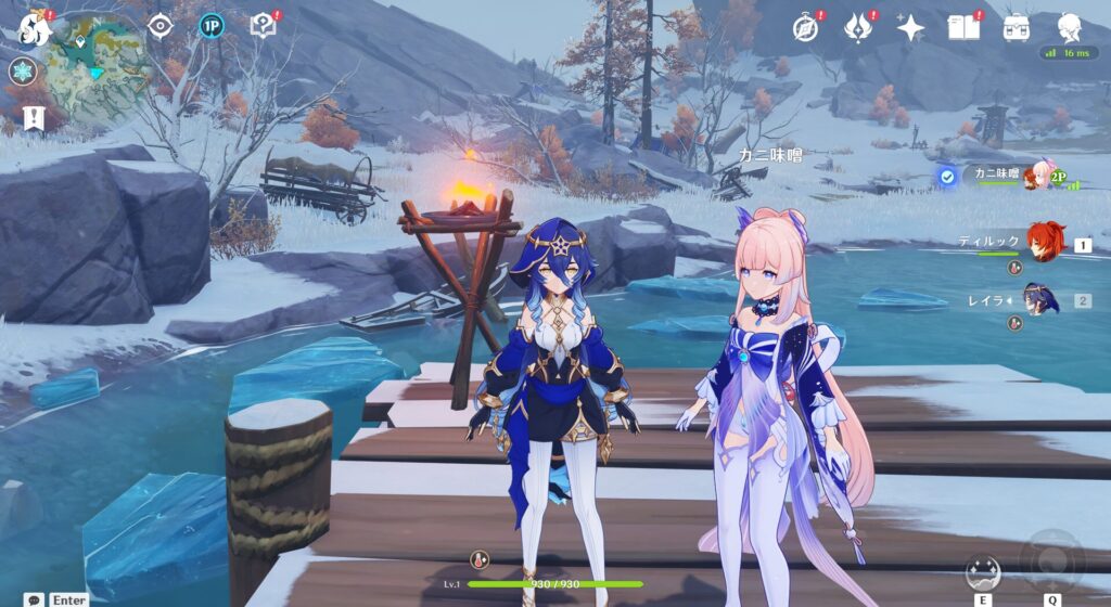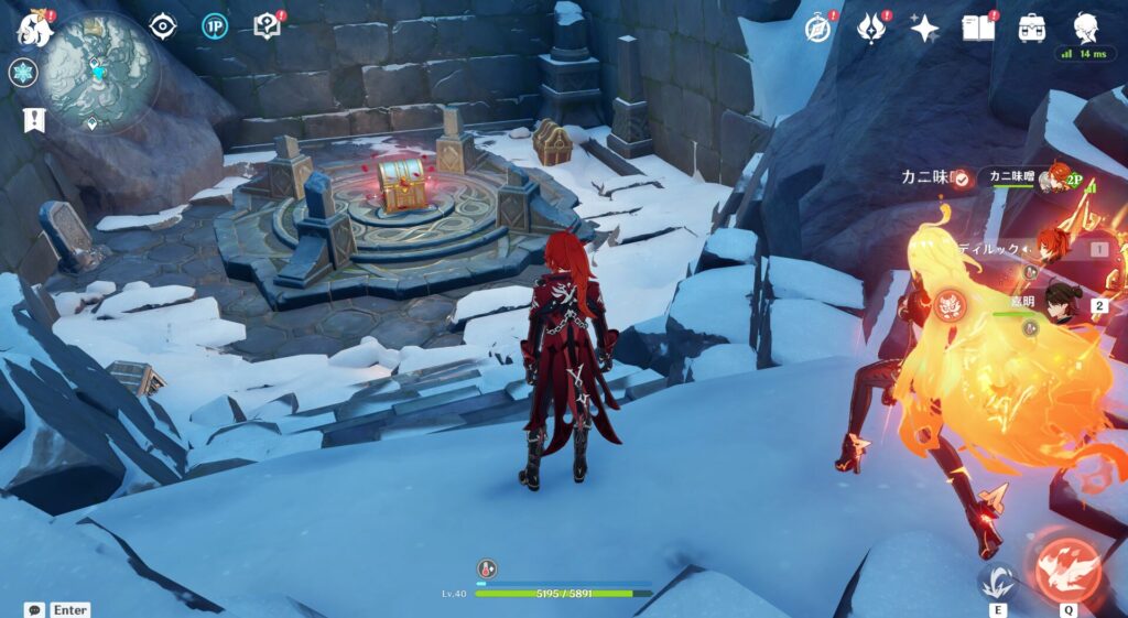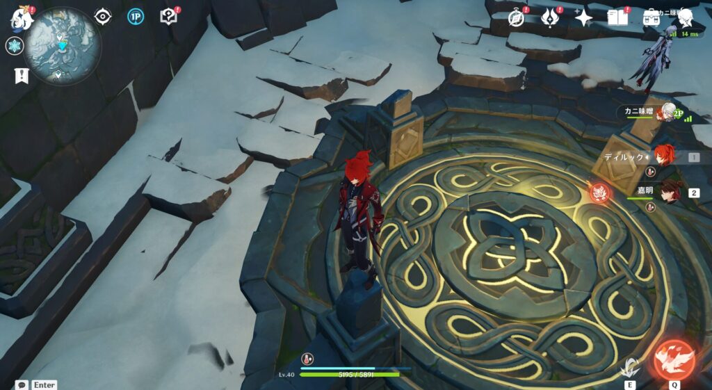 死にそうになってますが、極寒ゲージは手持ちキャラ全員に共通であるもののHPの減りは個々人ですからディルックさんに命のリレーをして装置を起動しました。あっぶねぇwwwしかもうっかりしてて耐寒料理の効果が切れてることにも気付いてないっていうね…