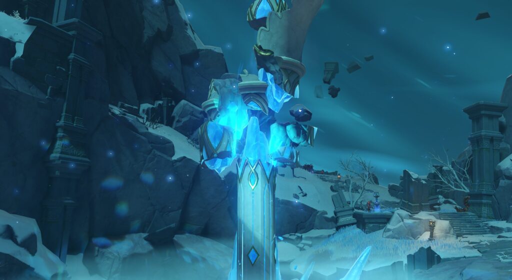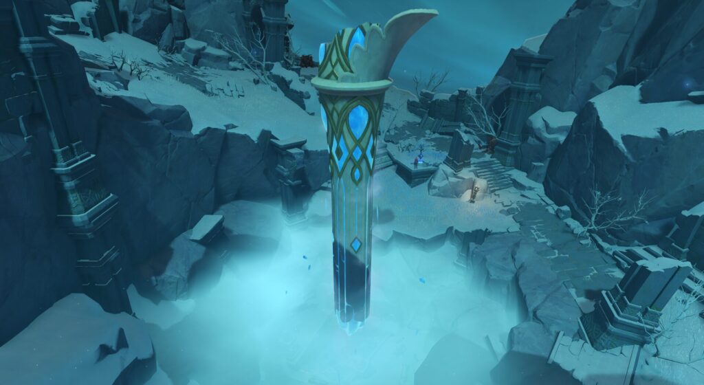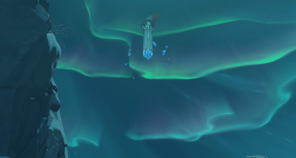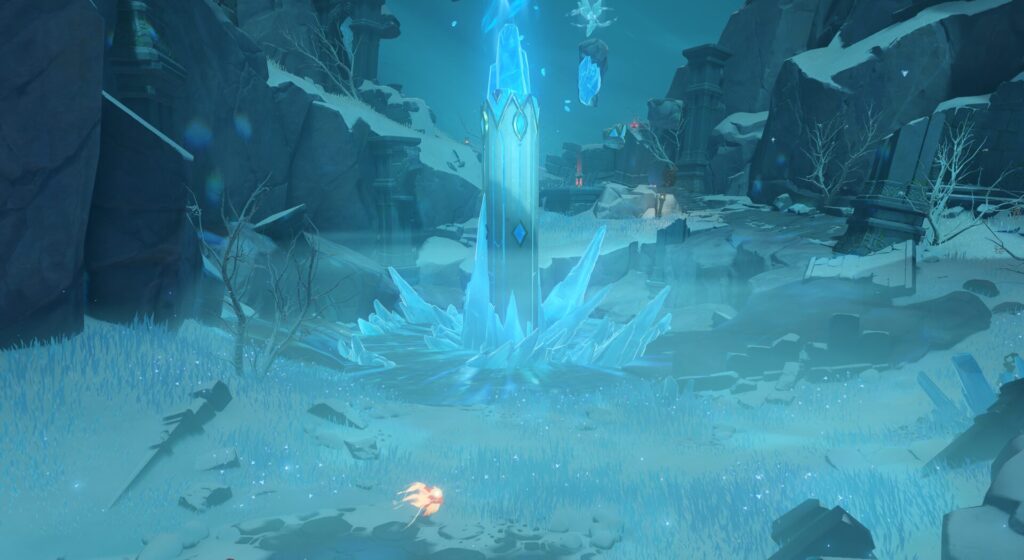 えええ~?!なんやったねんあれ?!って感じですが、あの柱については後日にちょっと追加情報があるのでその時にまた色々説明します。で、柱が飛んでいってしまった後にパイモンが「柱の下の氷が割れて何か出てきたぞ!」と言ってきたので向かいました。
