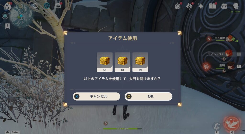 当たり前ですが432さんのパーティー(1番強いディルックさんとリオニキがレベル40)では入ることすらできません。だってここ、ランク30が最低ラインとかいう話なんだよ。じゃあ順当に考えてモンドメインストーリーのクリア後に来る感じの場所じゃねえな!!
