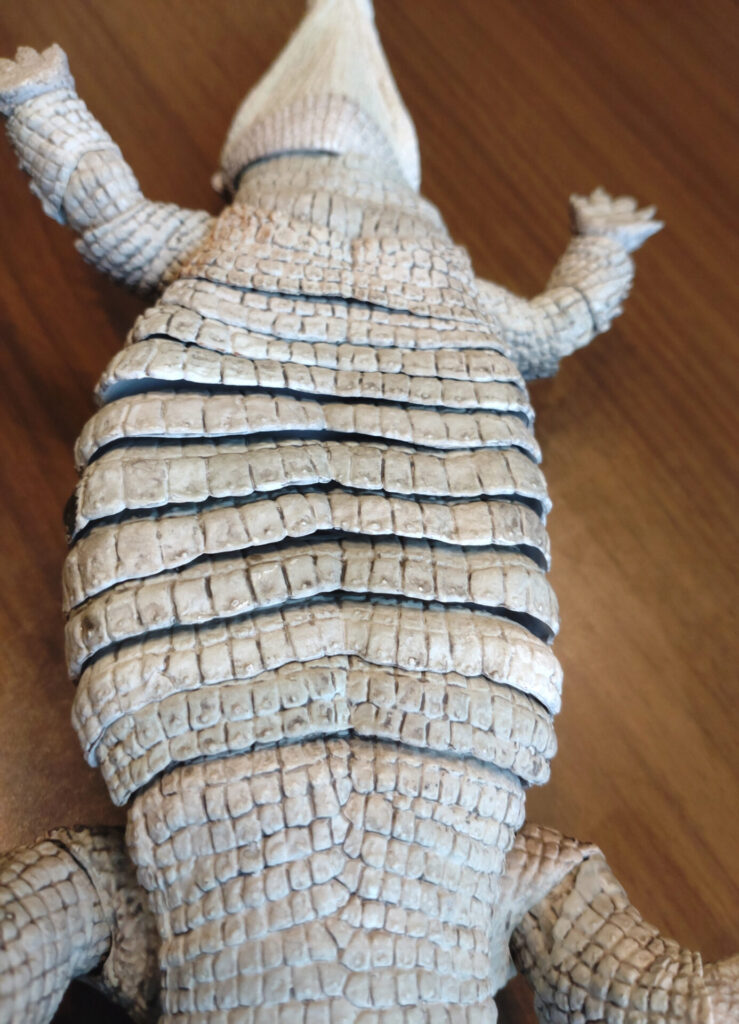 裏も丁寧だよ!!拡大するとこんな感じでして、ゴツゴツした表皮を感じますね。ワニが裏返ってるところを見ることってまずないと思うんですけれど、ちょっとツチノコ感があって可愛いかもしれない。