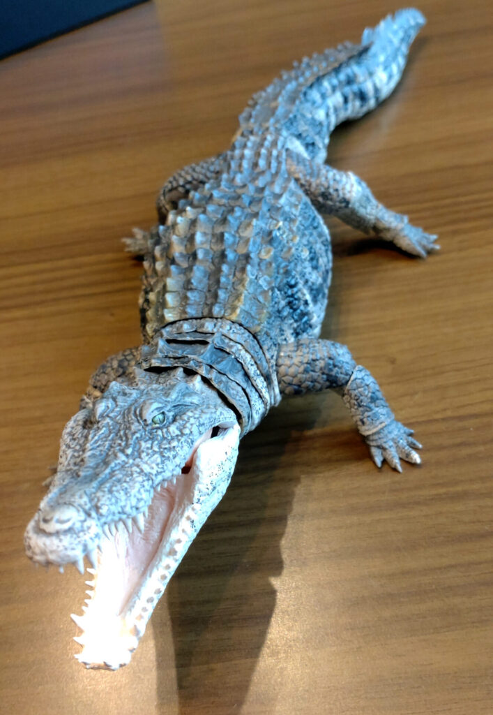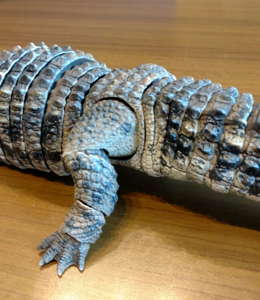 ただこちら、ものすごく稼働するとかではなかったです。元々ワニの脚がそういう感じというのもあると思うんですが、脚の可動域のところに玩具っぽくなっちゃう隙間を出さないように工夫してるんだって。つまり、生き物としてありえんポーズを取るとかそういうのは得意じゃないっぽいですね。