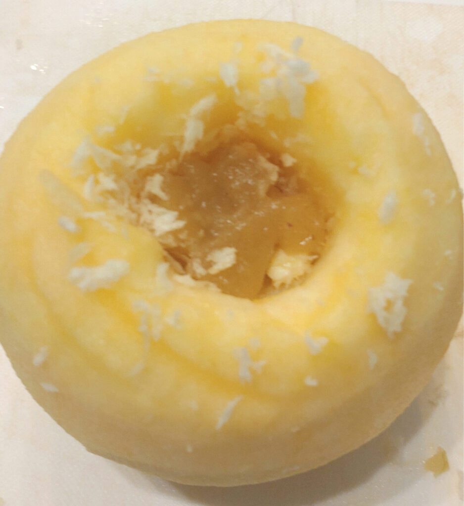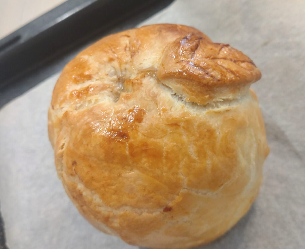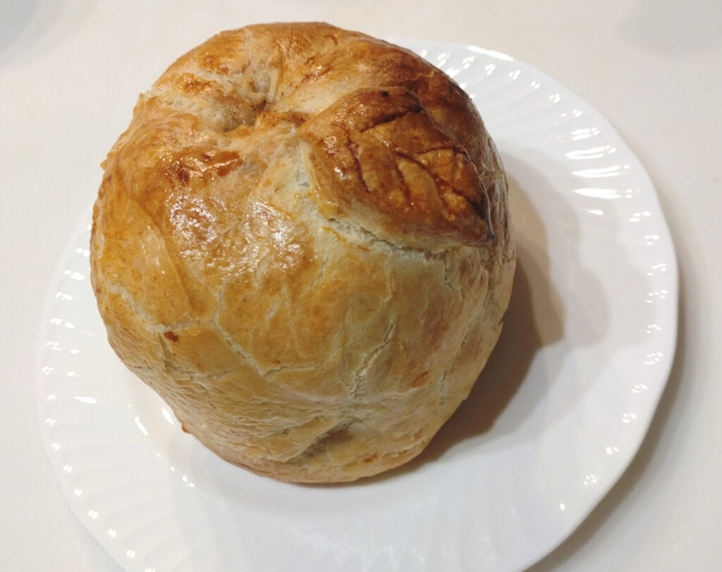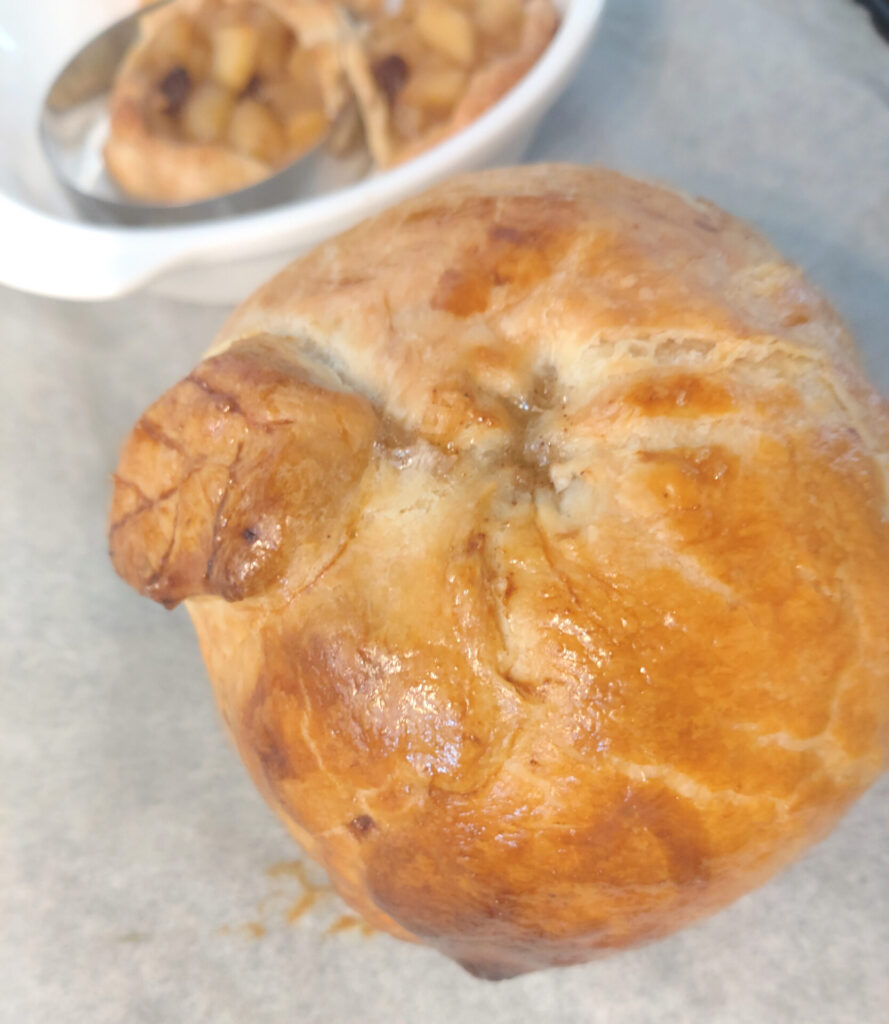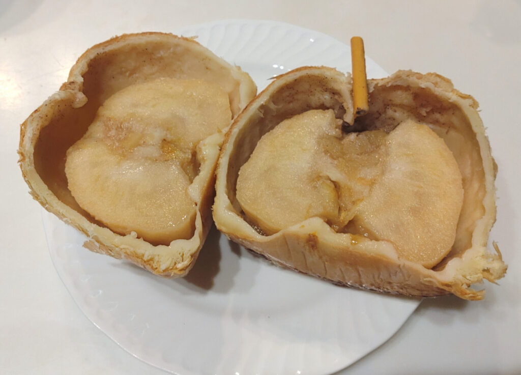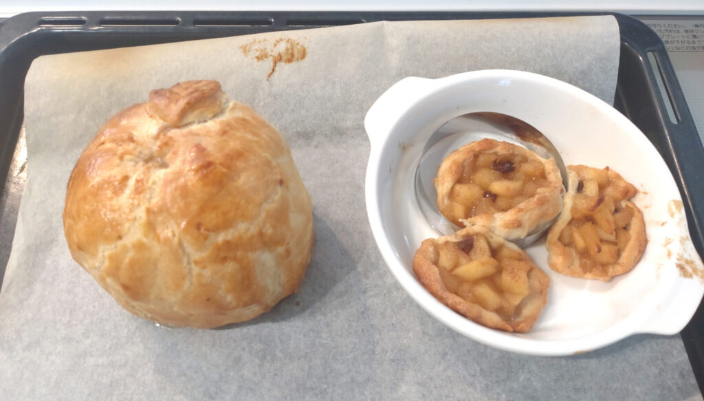 多分中のりんごは熱が入って縮んでいると思うんですけれど、それに対してパイ生地の方は加熱で膨らんでいるはずですからね。元々のりんごよりも一回り大きなサイズとなっています。