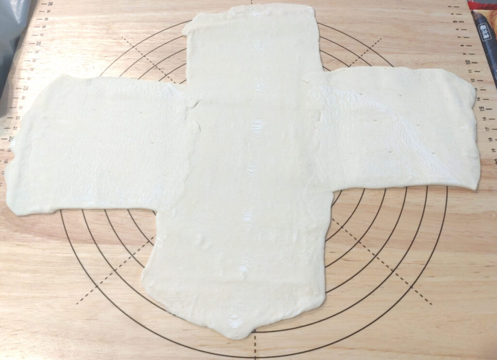 まずはパイシートを上記のように十字に広げます(これが地味にめんどい)。今回、自分はパイシートを2枚使いました。以下のとおりです。