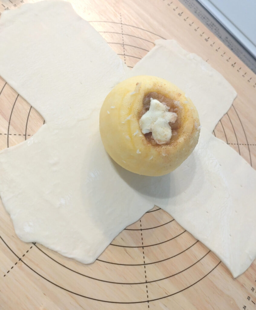 こっからですよ…!これをうまいこと整えてパイシートでりんごを包むんです!まずは四枚の四角をセオリーどおりにりんごにパタンパタンと畳み掛けまして、こんな感じにします。