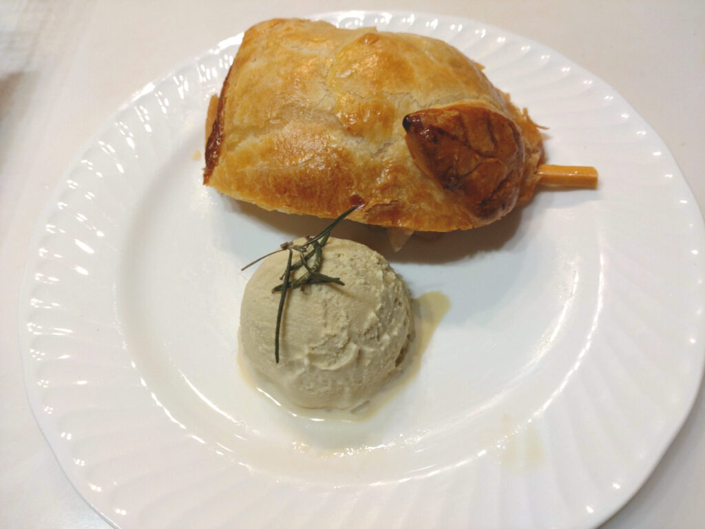 では盛り付けていきましょう!おしゃれなパイの隣によく分かんないけどおしゃれっぽいアイスが乗っているなんて最高に映えるに違いありません。ついでに去年から冷蔵庫にいたと思われるローズマリーも添えれば…