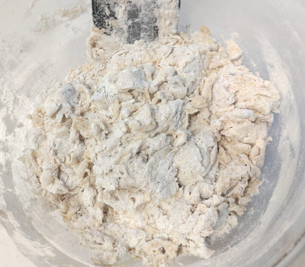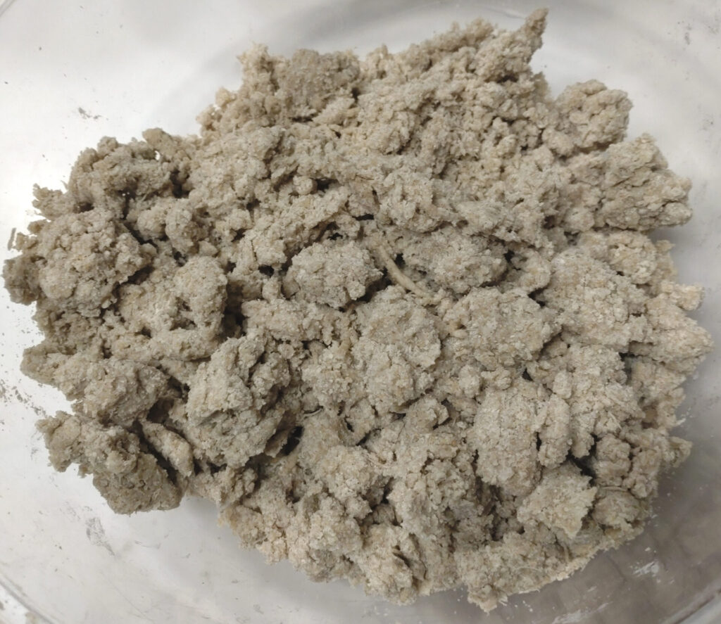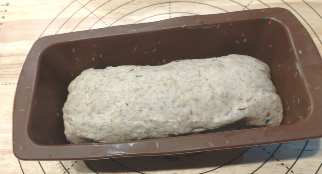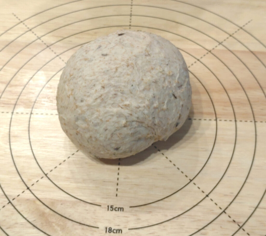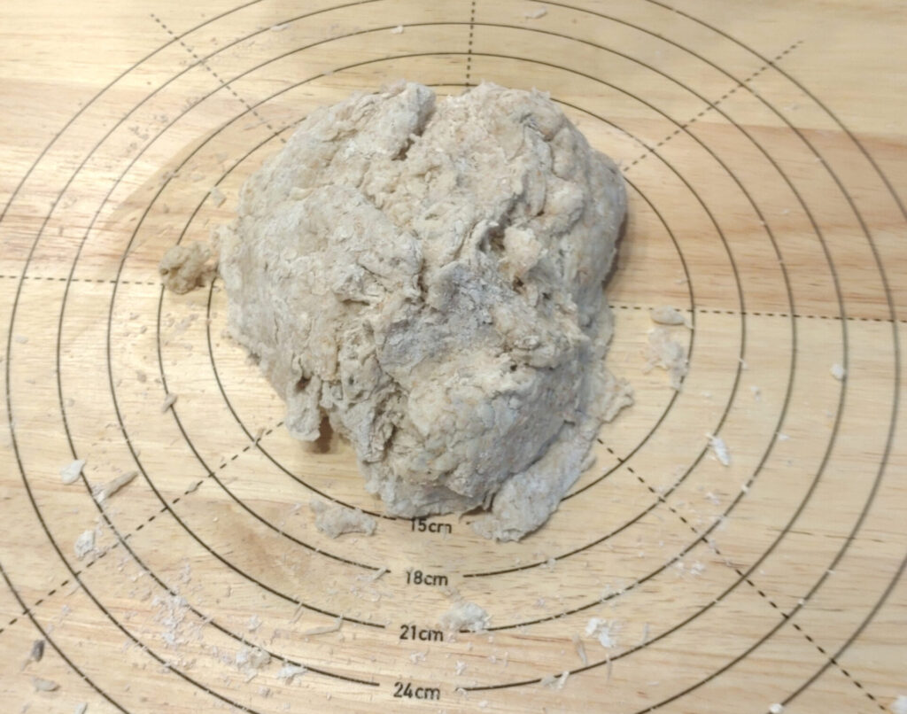 なお、こねていますと結構生地がブチブチとちぎれやすいことに気が付くかもしれません。ですが、これは全粒粉が入っているパンだと起こる現象ですのでそんなに気にしなくていいよ!ちゃんと後で膨らみます。
