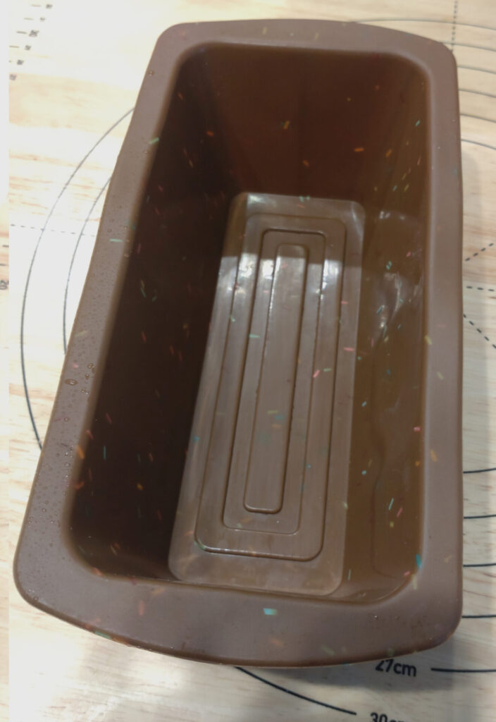 これは僕が愛用しているダイソーのシリコンパウンドケーキ型でして、今まで数々のパウンドケーキ、ガトーショコラ、チーズケーキ、果てはゼリーだったかプリンだったかも仕上げてきた歴戦の兵です。なお、サイズは17.4cm ×8.7cm ×6.1cm。先述した一般サイズのパウンド型(18×8×6cmで容量約750ml)とほぼ同じくらいです。