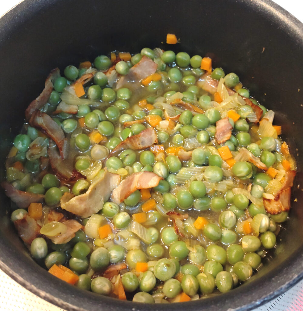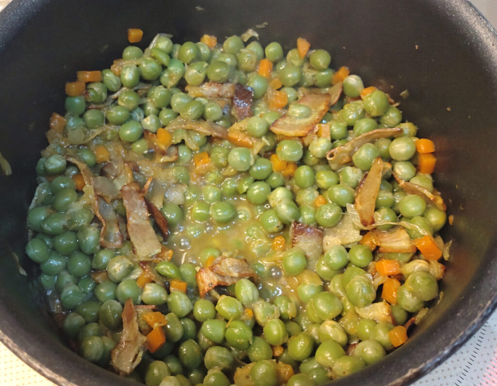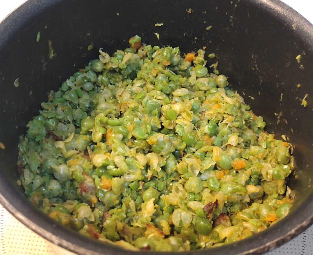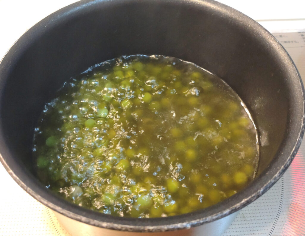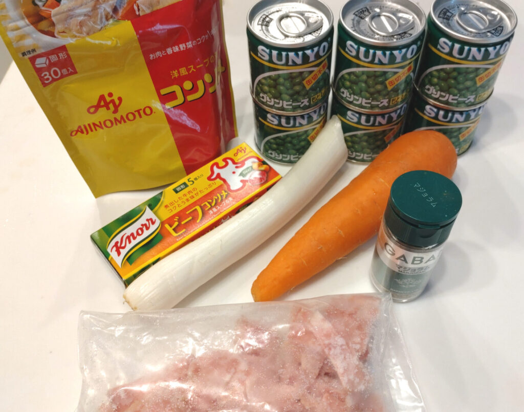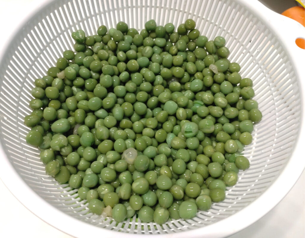 ただここで注意したいのはグラム。レシピのグリンピースは乾燥状態の重さです。つまり缶ピースを買う時にはそれを加味して購入しないとならない…!文科省の「日本食品標準成分表 一般成分 重量変化率」によると乾燥した豆類を茹でたら軒並み200%くらいまで増量するみたいですので、それに合わせて準備しましょう。