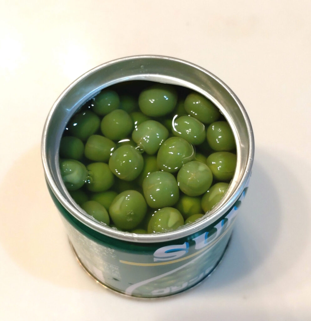 いや~…缶に入ったグリンピースなんていうもの初めて買いましたよ…スーパーの缶詰コーナーでやっすいライトシーチキン買いつつ「どんなおしゃれセレブが買うねん、こういうの…」って言ってた缶ピースを買っちゃいましたね!