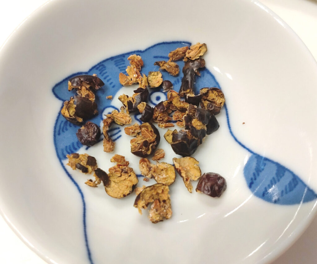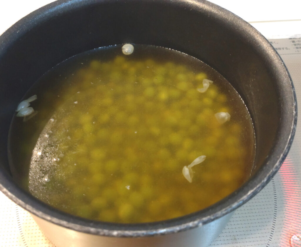 これがちょうど20分くらい煮た後の豆ですね。一応味見したんだけど、フツーにお料理に入ってるくらいの固さやな、と判断して次の工程にいきました。が、ここでもうちょっと豆煮た方が良かったと思う…!