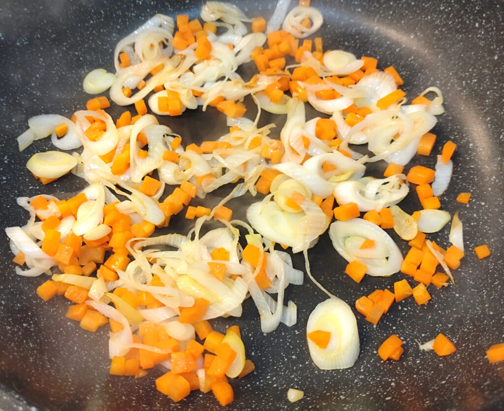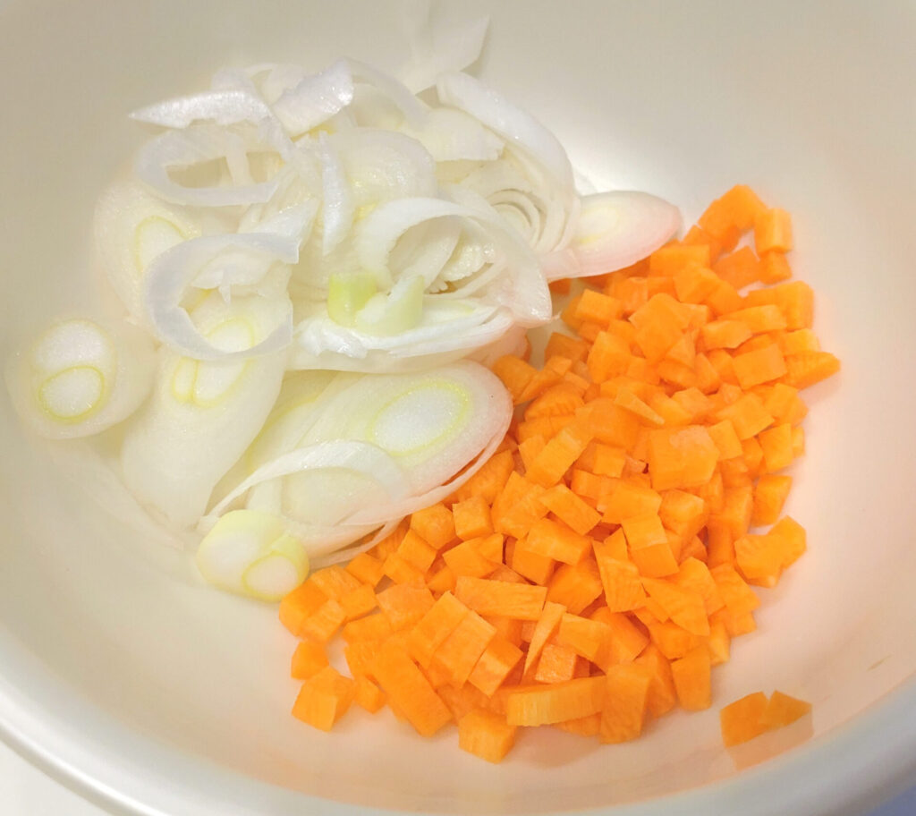 さて、豆を煮ている間に他の具材を炒めましょう!ネギと人参ですね。