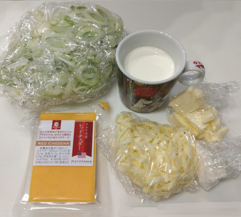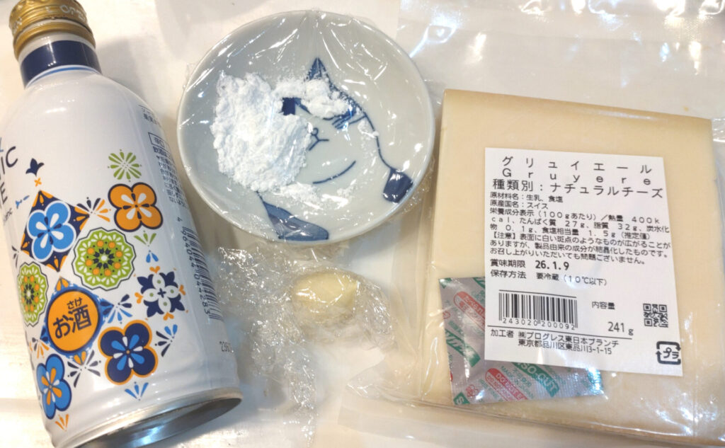 カジートはみんな大好きというチーズフォンデュの材料はこちら!!ちなみにこれはお持ち帰りさせることが物理的に不可能だと判断し、少なめの1/2量で作っています。