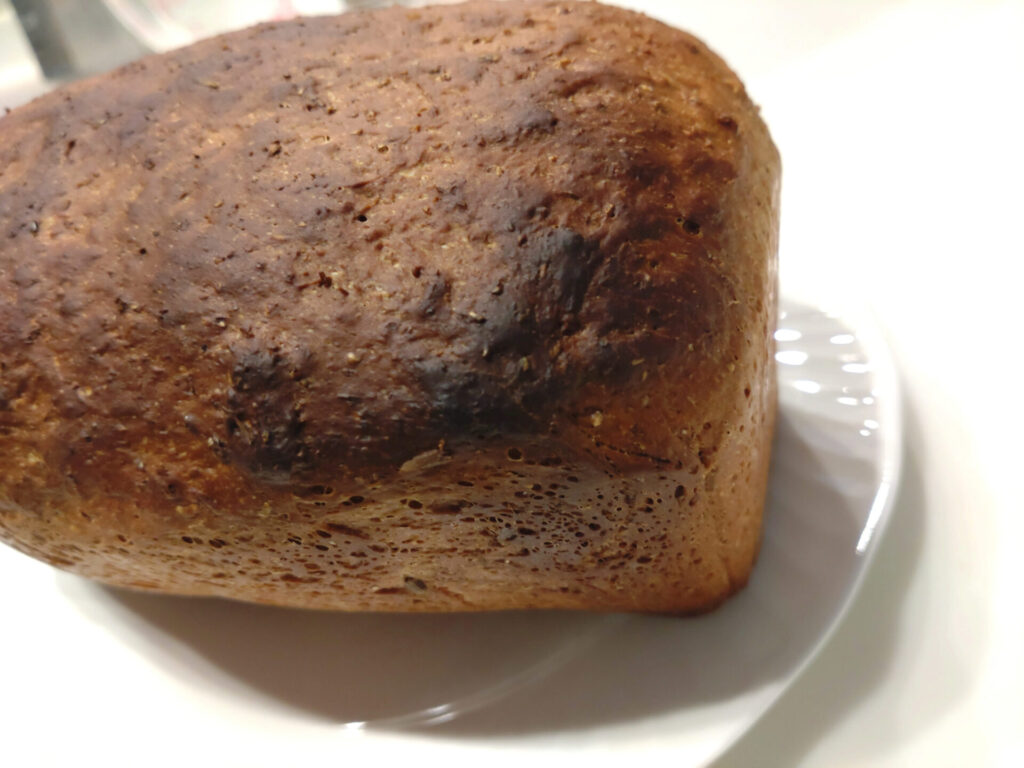 結局、2000mlくらいある型じゃねーと本来のパンは焼けないんじゃないか?という疑問を浮かべながらサイズ感謎すぎるパンを焼いてみましたところ…こんな感じ!!