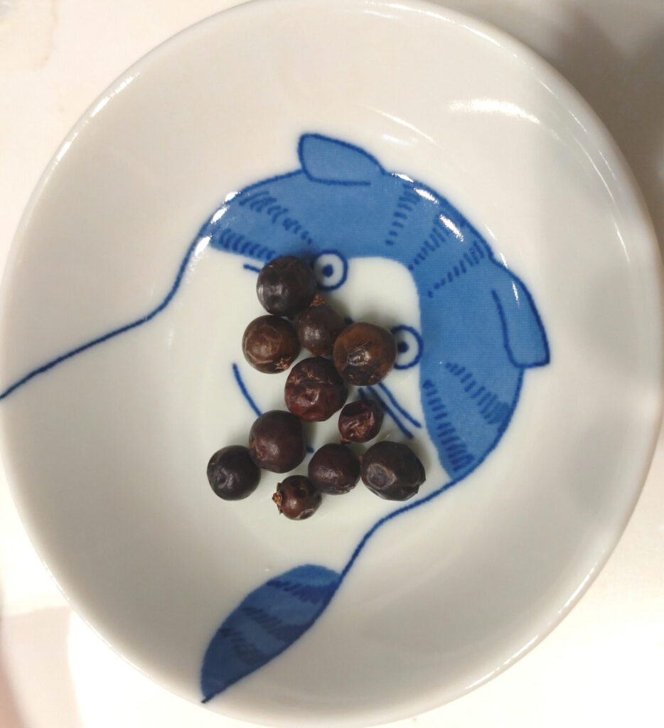 これ確かマルカルスの山ん中とかによく生えてるやつだよな?!すげー!実物があるのかよ!と僕も驚きました。ちなみに購入先は中華街の香辛料ショップです。ジュニパーベリー自体はアマゾンでも販売しています。