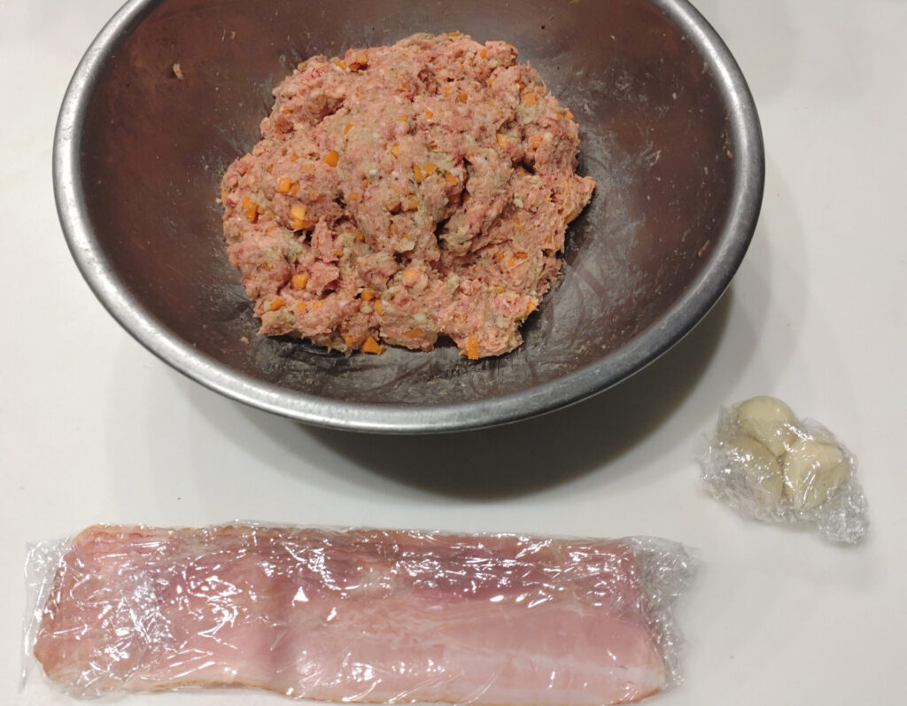 今回は食うやつが2人だけなので半量で作ろうと思ったのですが、肉の計量をミスってしまいまさかの全量と大して変わらん量で作りました。まあ、お持ち帰りで包んだら何とかなるから大丈夫やろ!ちなみにホーカーローフは前日仕込みで野菜とかをみじん切りにしておくとマジで作るの早いです。混ぜて成形して焼くだけ!!唯一の難点は小一時間オーブンを占拠することだけです。