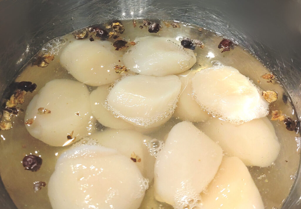 缶から出した時点ではちょい堅いけど指で潰れるくらいでした。なるほどな…調理による加熱を見越して固めにしてんだろうなあ。ではこれをブイヨンと一緒に煮ていこうぜ!