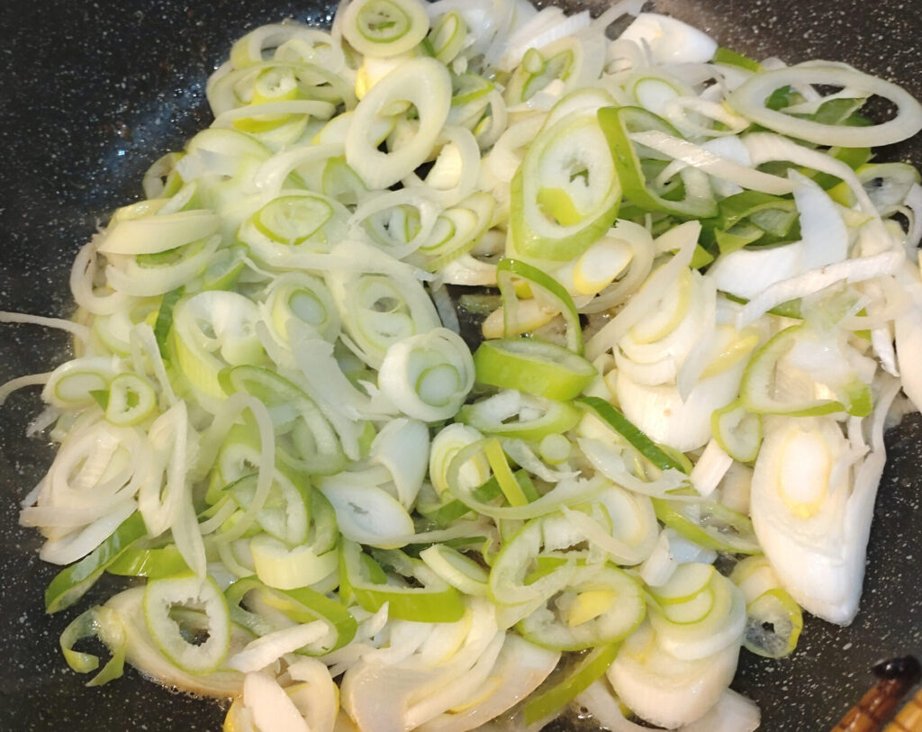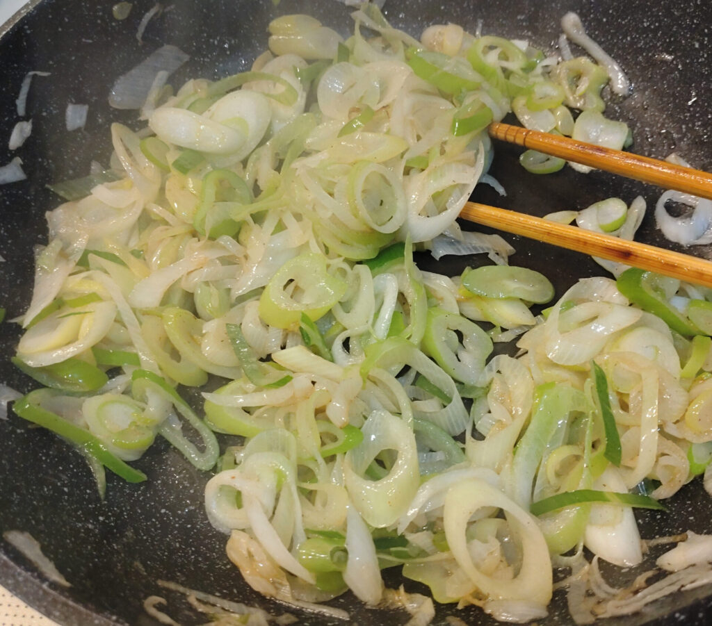 これなら二轍を踏むことはないはずだ!!ということで、中身を作っていきましょう。さっき言うてた大量のネギを炒めていきます。薄切りにしてはちょっと分厚い気もしますが、この程度の切り方で問題なかったよ!