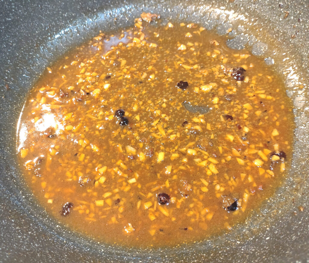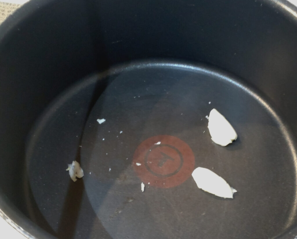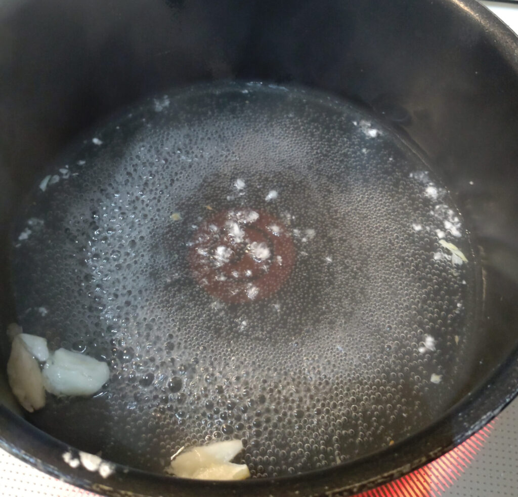 で、作り方自体は簡単です。鍋にまずニンニクを投下!するんですけれど、この時鍋にニンニクを擦り付けるという作業が発生します。なんかテフロン加工の鍋でやりにくかったからアルミ鍋とかのがいいかもしれん…