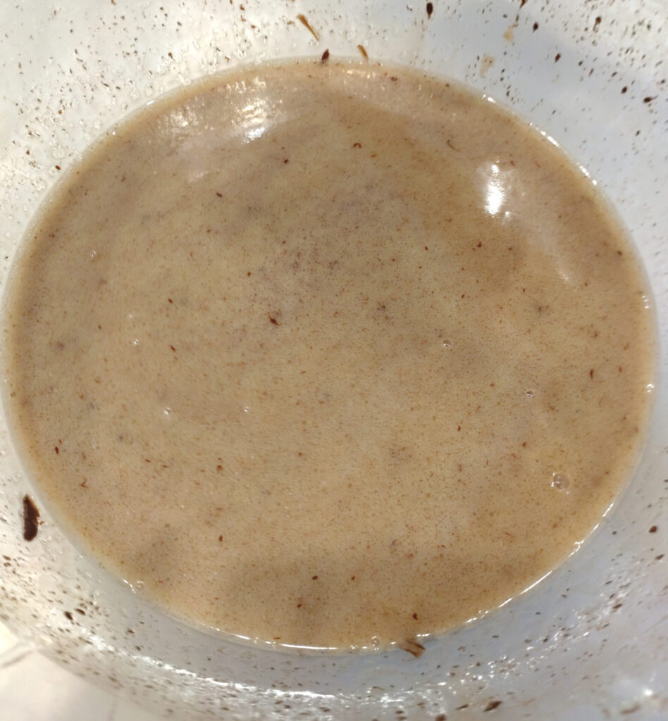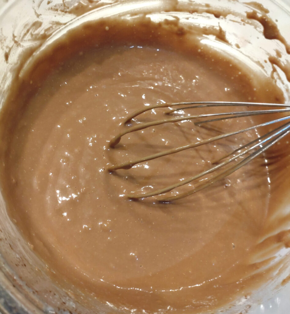チョコレートの破片を序盤のバターだの何だのっていう液体系の材料に入れただけだとこのくらいのカラーチェンジになります。入れたチョコは40gだよ!