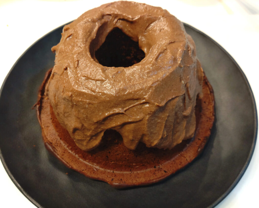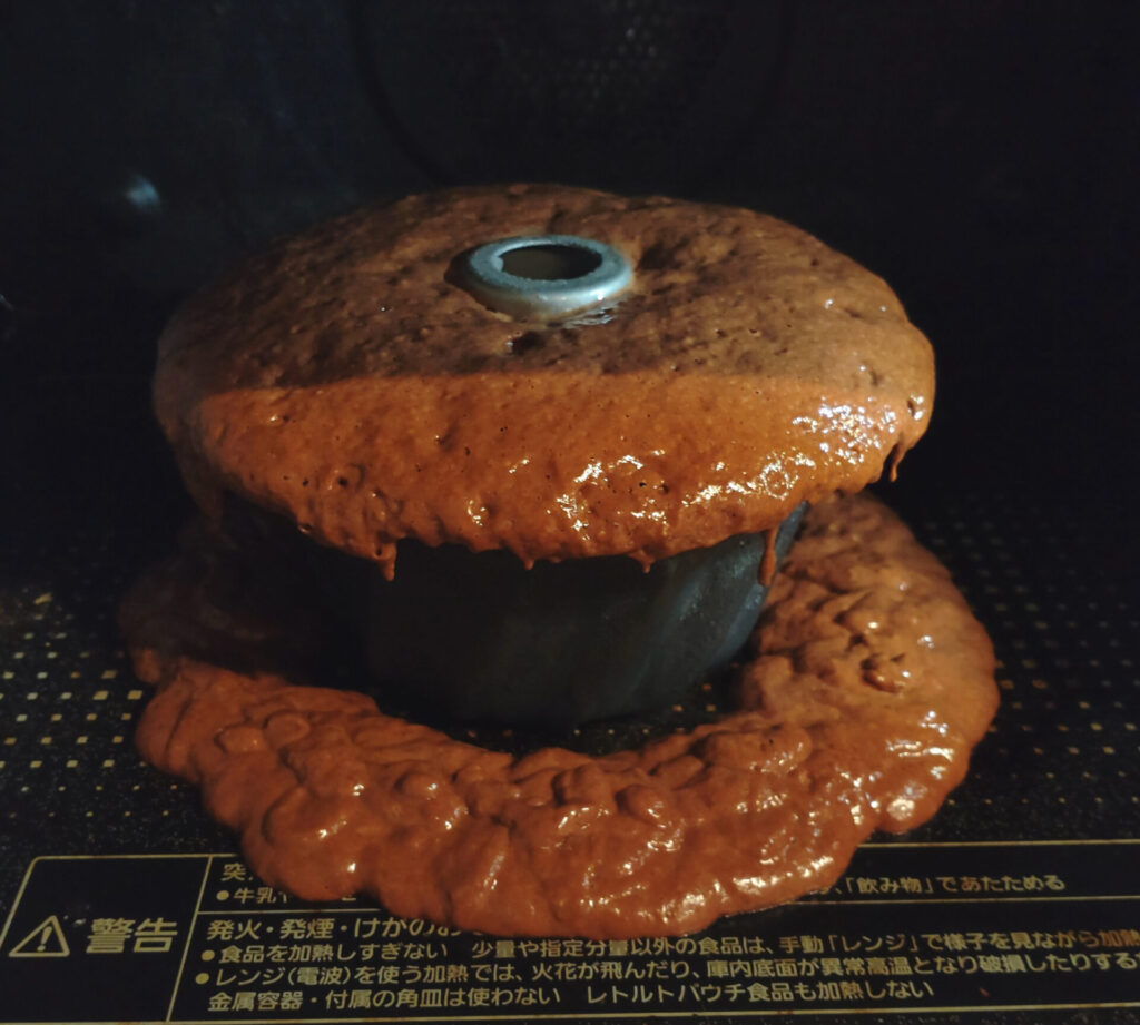 土台の部分が広がっているのでシルエットは本家に少しだけ近付いたかもしれませんね!焼き上がりの香りは甘さよりもチョコレートが勝ってる感じでした。で、こいつをお皿に移すとだな…