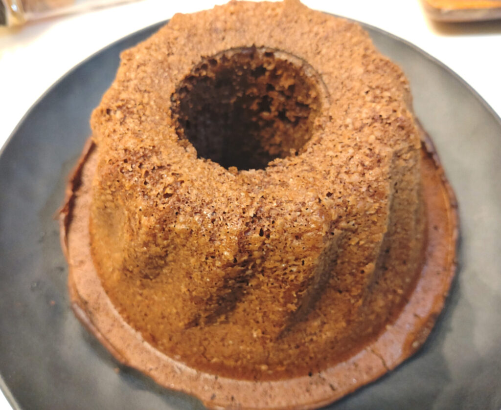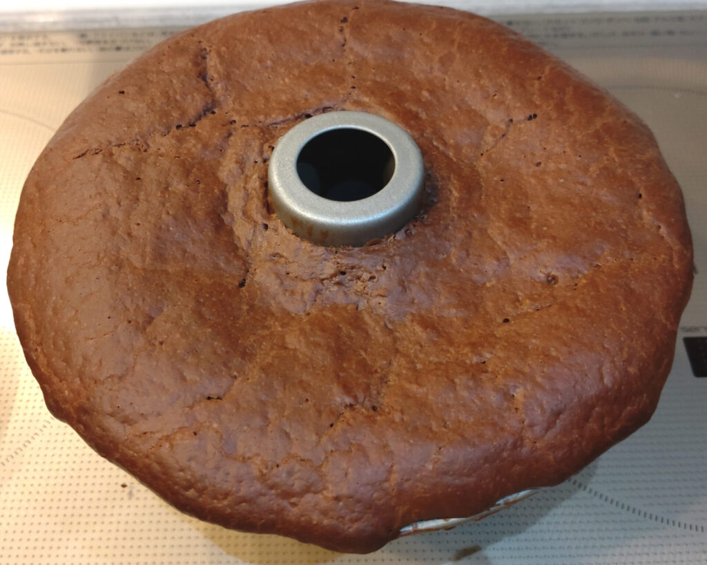 え、めっちゃ容赦なく膨らんでるじゃん…このパウンドケーキ型でも結構ギリギリだぞこれ?!ということは、やはり本来は一回り大きな型でなければならないはず。絶対450mlじゃねーよ、1000mlくらいないと無理だろ多分!!しかもこれ、1/2量だからね?!