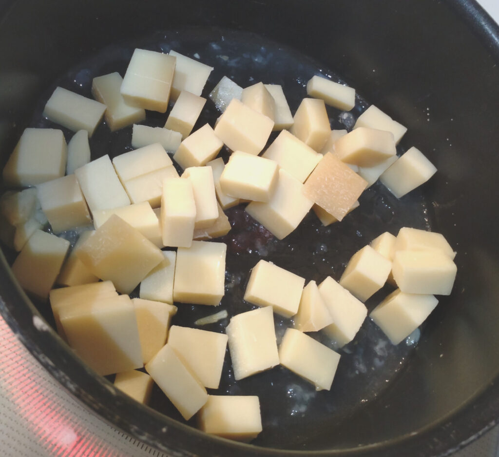 結構ハードなタイプのチーズですが、実は意外にも溶け切るのにそんなに時間かからない。