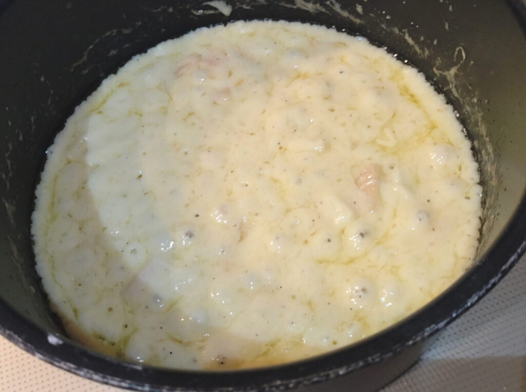 さて、ここからですよ。中力粉と生クリームを少しずつ投入してとろみのついた具にしていくんですけれど…その手の作業は粉がダマになるからな!!ホワイトソースを作る系の作業ですね~