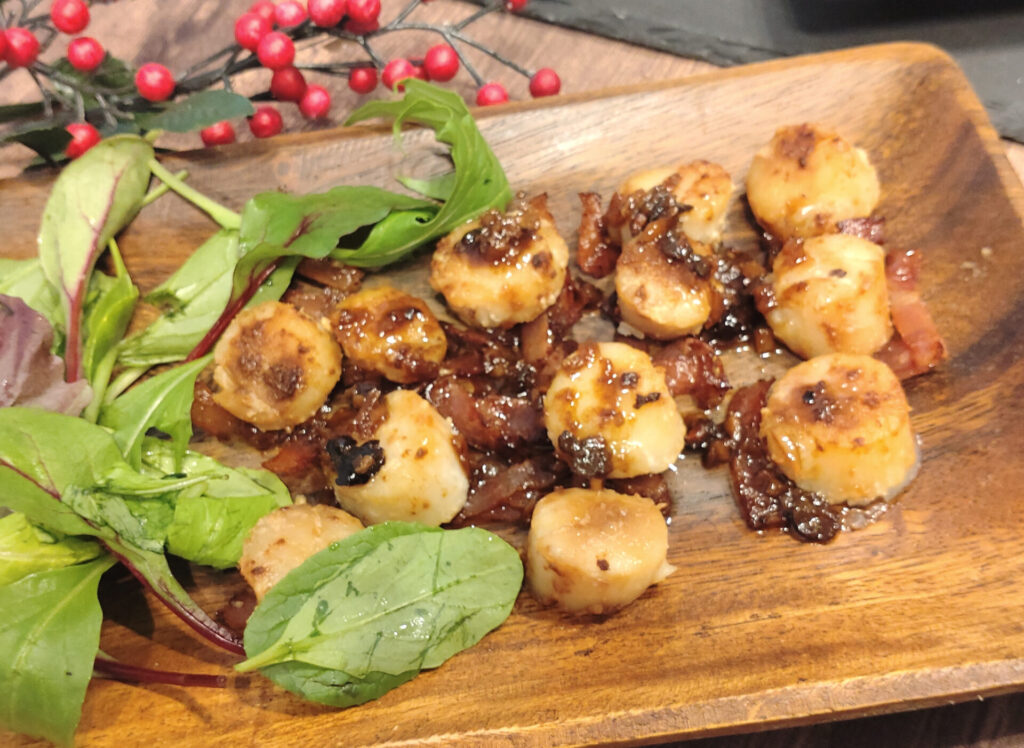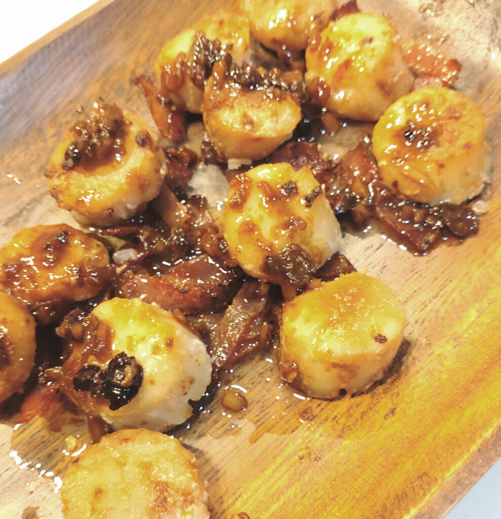 これ序盤結構シャバシャバなんだけど、信じて煮詰めていったらちゃんととろみがつくので安心してください。最終的にはカリカリベーコンとホタテの上からこのソースを掛けると完成です!