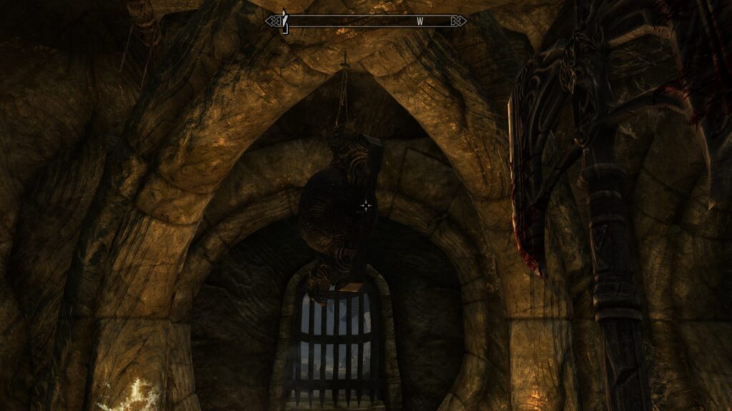 で、こっからですよ。なんとこのアジト、古代ノルドの墓に繋がっているんです。カタコンベみたいなやつですね。ということは、ドラヴグルが容赦なく出てきます。トラップもあります。このダンジョンはここからがしんどいんだよ…!