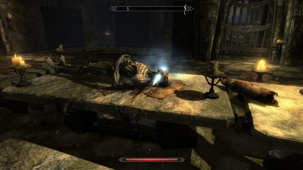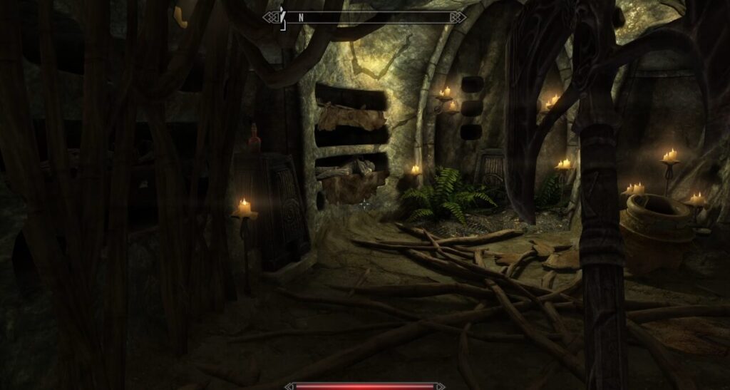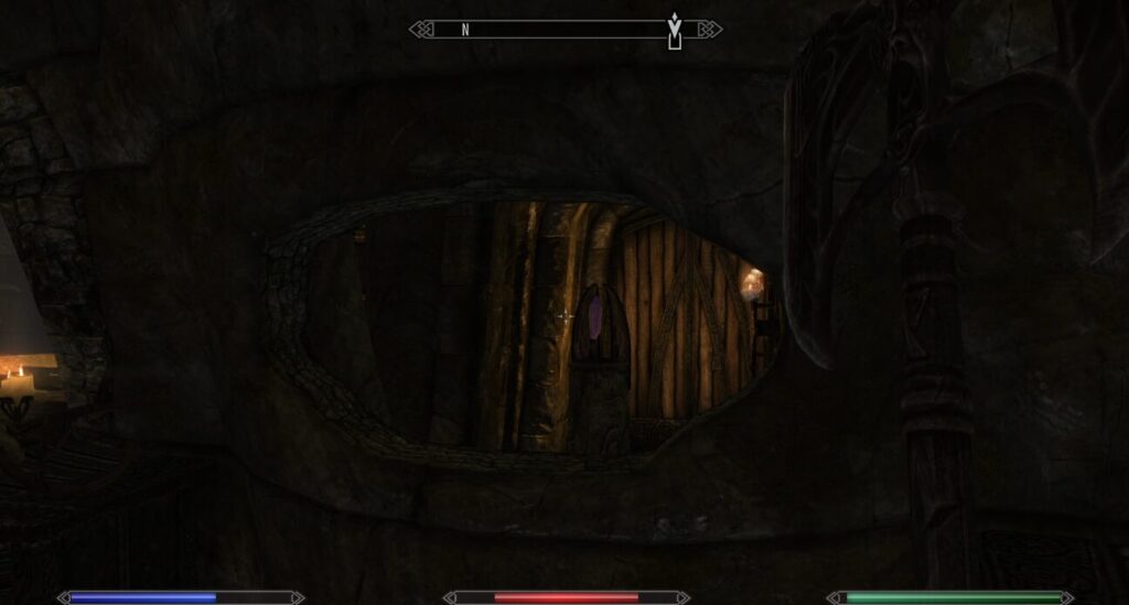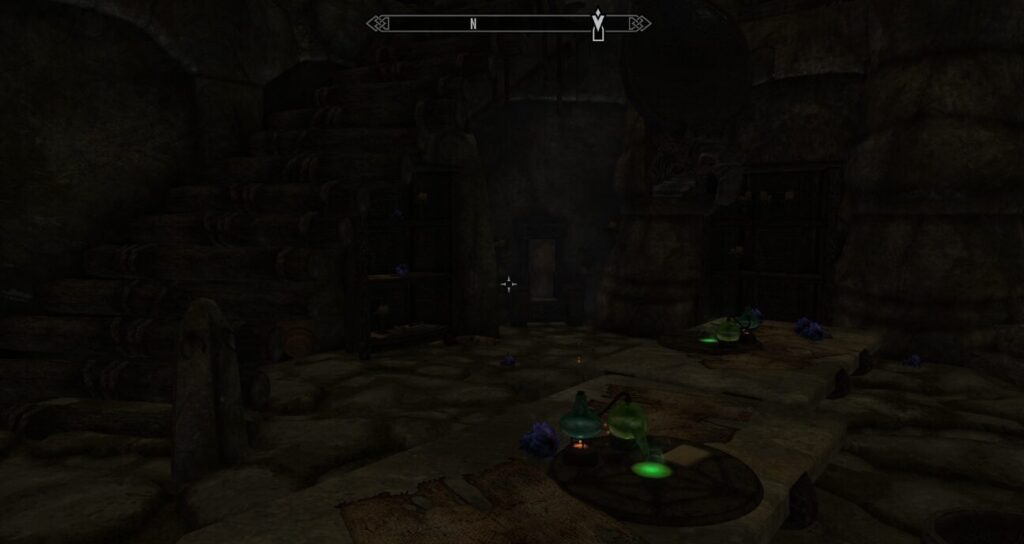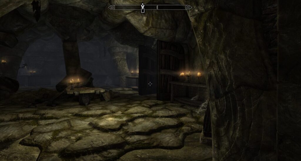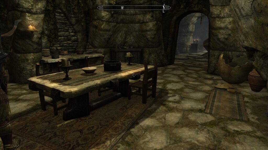 何なら家具がほぼ一切何もないレイクビュー邸のリビングよりもリビングしています。てか明かりついてるしね?確かノルドの古代遺跡とかのマジで生命体が無人のとこは明かりはついてないはず…(思い違いだったらスマン)