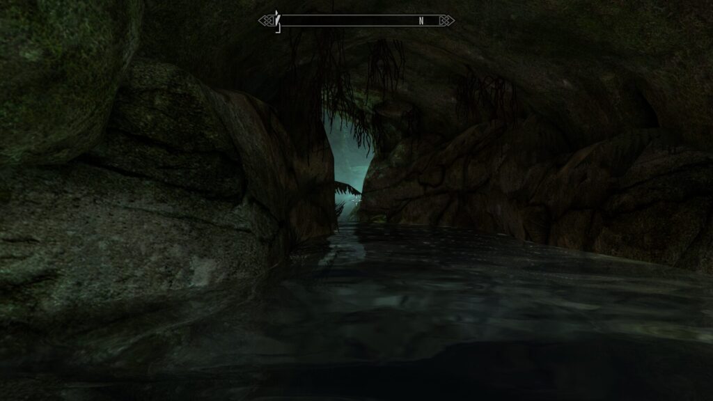 たまに遺跡とか洞窟でこういう水泳したら先に行ける系のスポットがあるんですけれど、今のところ可能な限り避けるようにしています。ゴリラ自体に窒息ゲージがあるということと、純粋に怖いからです。いつかアルゴニアンに転生したら行こうよ!ここは!多分貴重なアイテムとかあると思うけど、怖いから!!行きたくないってかもう、それ通り越してこの時点で帰りてえ感情の方が勝ってるんだよ!!