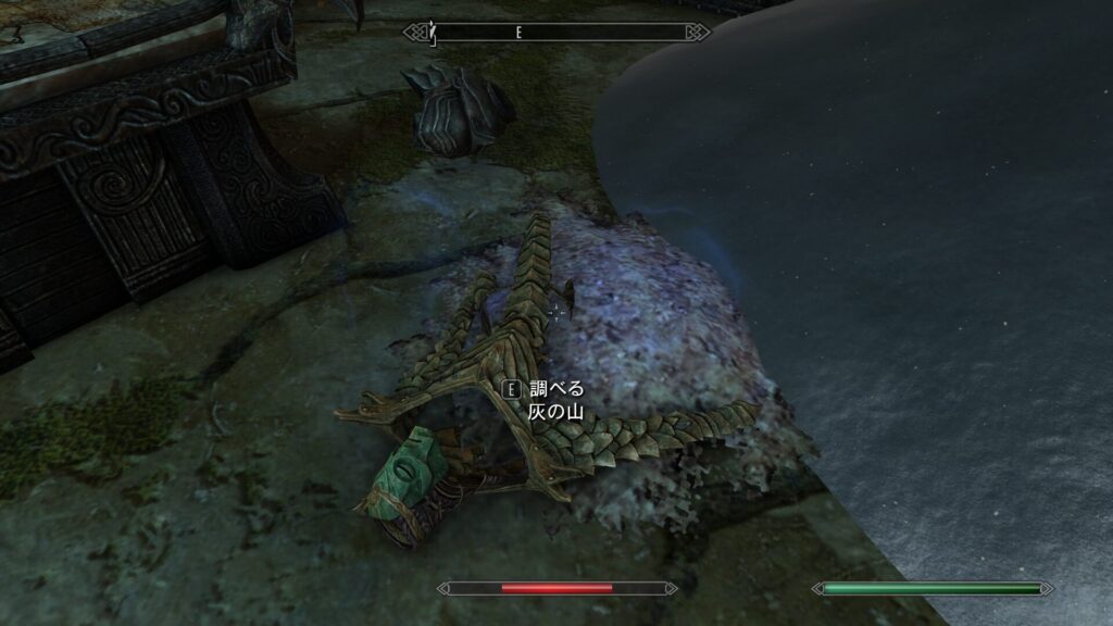 つまり、石の電撃とドラヴグル2匹の襲撃をかわしながら、普段から全く使ってない弓矢で石を落とさないといけないんですよ!もうここがこの遺跡で1番辛かったと言っても過言ではない。弓構えてる間にシャウトも電撃も食らうし、一方的にボコボコにされるしッ!!