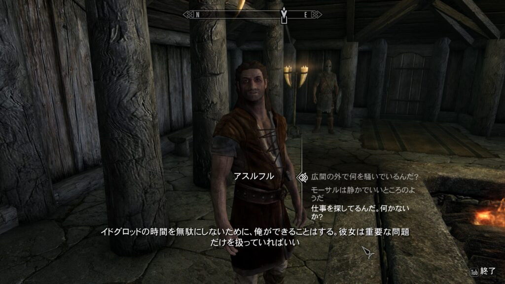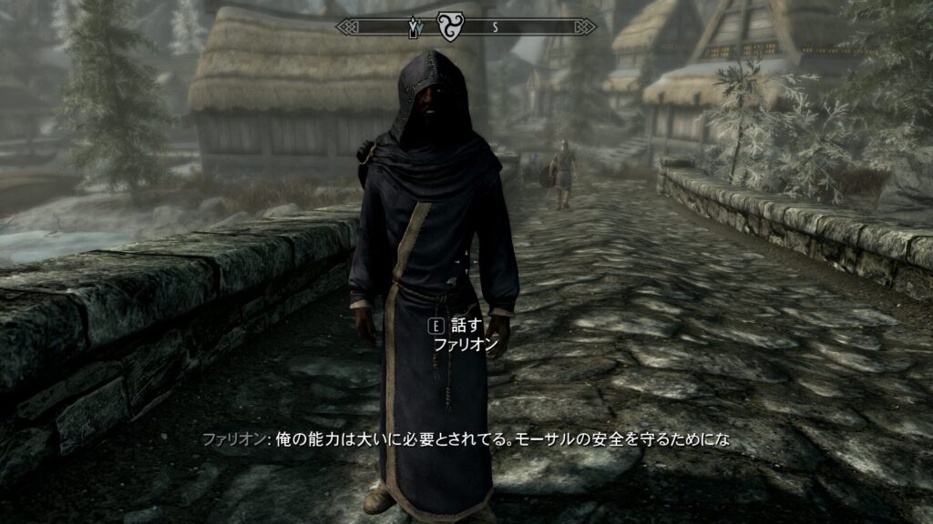 こちらのヨルゲンさんなんですが、首長は頼りにならないと思っているそうです。湿地からは夜な夜な化物の声が聞こえてくるし、そのタイミングでファリオンという怪しい魔術師がやって来てるし!といったモーサルの民の不安の代弁みたいな話をしてくれます。うん、まあ…それはちょっと魔法少女のタイミングが悪いわ…