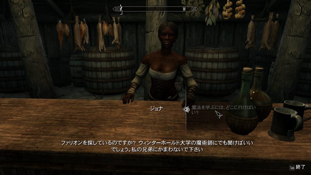 そうそう、さっき出会った陽キャGUYルーブクさんについても聞くことができます。どうやらルーブクさんは吟遊詩人気取り(正式に吟遊詩人ではない?)らしく、他のお客に迷惑をかけないか心配、とジョナちゃんは言ってました。いや心配どころかこんな怖い町において勇気をくれてるよ?!彼めちゃくちゃいい奴だよ?!