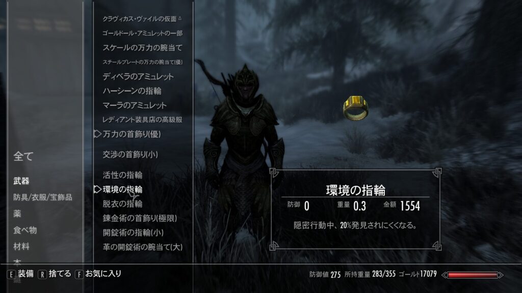 ですがご安心ください。そんなニンジャを助けてくれるアイテムがあるんですよ!まずはこちら。環境の指輪といいまして、ファルクリースでお手伝いをした時にもらったアイテムです。隠密行動に20%のバフがつきますよ!