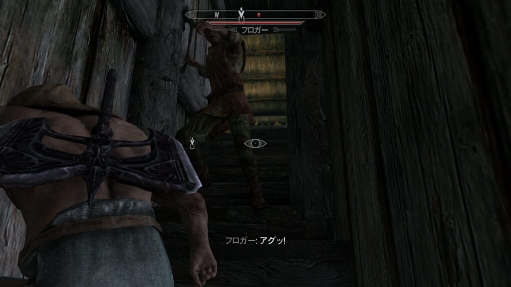 ※この時は気付いていなかったのですが、衛兵さんが駆けつけてくるのは不法侵入に対して善良な市民が「帰れ!」と3回警告を発した場合です。フロガ―さんは警告なしにソッコーで襲い掛かってくるので多分ポリス通報は起きないイベントだと思われます。
