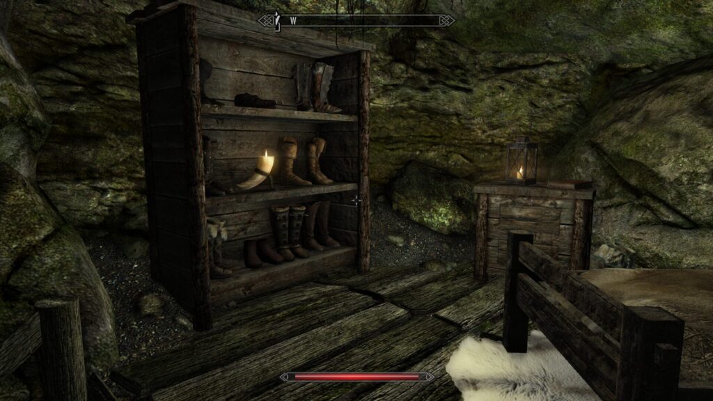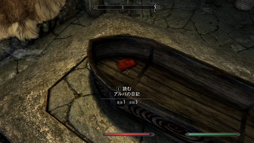 多分、ちょっといい焼肉屋に行ったら肉についてる「上カルビ」「ロース」の札みたいなものなんでしょうね。「インペリアル男子20歳」「レッドガード女子30歳」みたいな。ちなみにここ、結構な数の人間の死体見かけるんで、だいぶ派手に狩りをするタイプの吸血鬼の巣だと思います。吸血鬼は食料確保で目立つと討伐対象になってしまいますから、だいぶ大胆だよな?!