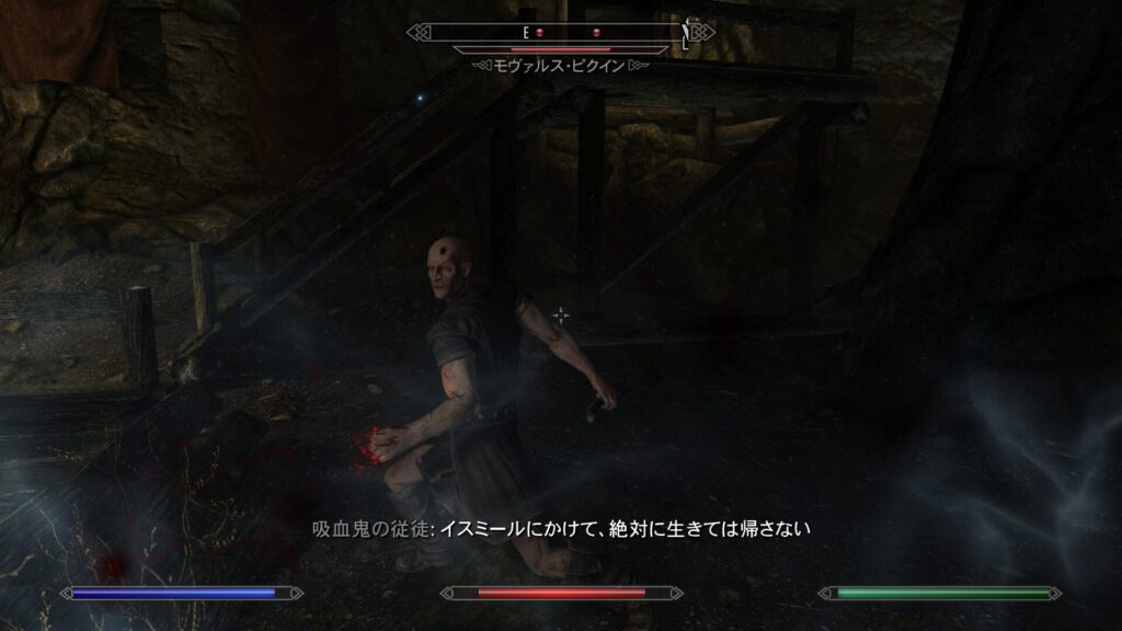 ところが、モヴァルスはオシャレにステ振りしていたのか大したダメージを出してこなかったんですよね。だからコイツに関しては特に強いとも思わなかったんですけれど、実は近くにいる両手武器持ちの吸血鬼の雑魚の攻撃が当たるとめっちゃ痛い。そっち先に始末した方がいいと思う!