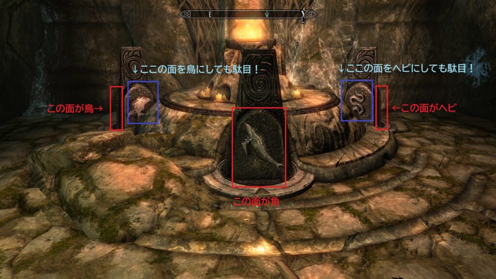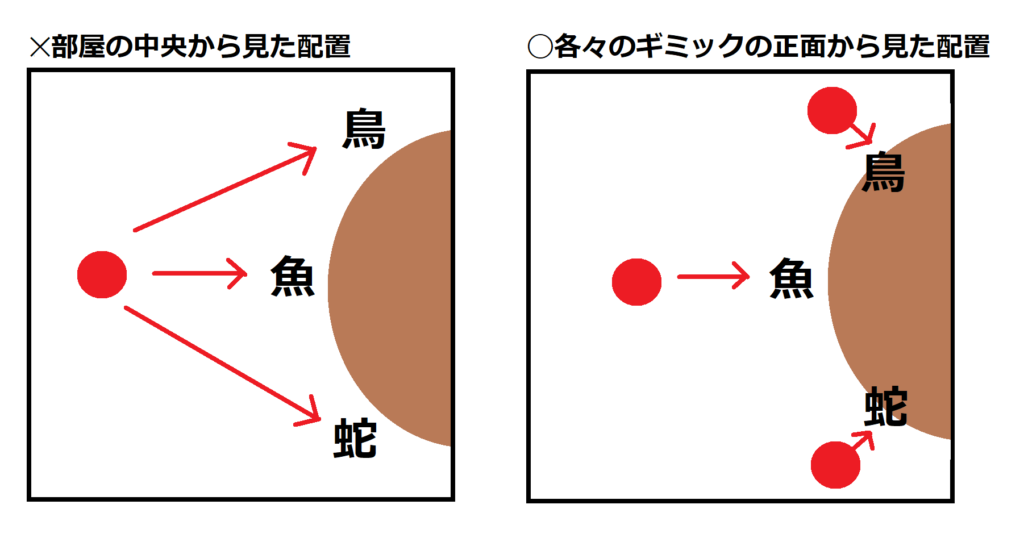 まず、左部屋のギミックの答えは奥から「鳥・魚・蛇」です。ところがギミックの向きが微妙すぎて最初戸惑ってしまったんだよな!部屋の中央から見て鳥魚蛇の配置じゃないねん。各ギミックの正面から見て鳥魚蛇なんです。