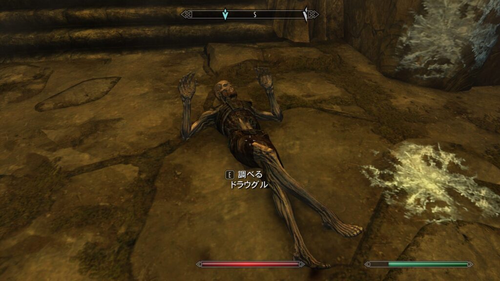 すっげーいい感じのステップ踏みそうなポーズで死んでるな、コイツ…生前はきっと陽キャだったのでしょう。ドラヴグルも出てくる時はあんなゾンビみたいなボイスとか地味に鬱陶しいシャウトとかじゃなくて、素敵なボックスステップとかで出てきて欲しいよな。そしたら遺跡はもっと楽しくなるのに…