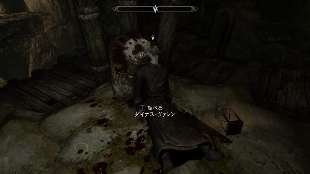 あと全然いらん片手斧しかないよ、アレェ~?!と思っていたのですが、どうやらコイツが寄り掛かっている柱の裏にクエストマーカーがついている模様。なるほどな?!回り込むとダイナス・ヴァレンさんというダンマーのおじさんが脳天をかち割られていました。あ、この人ゴールドールの伝説を追っかけてるゴールドール推しの人じゃないですか!